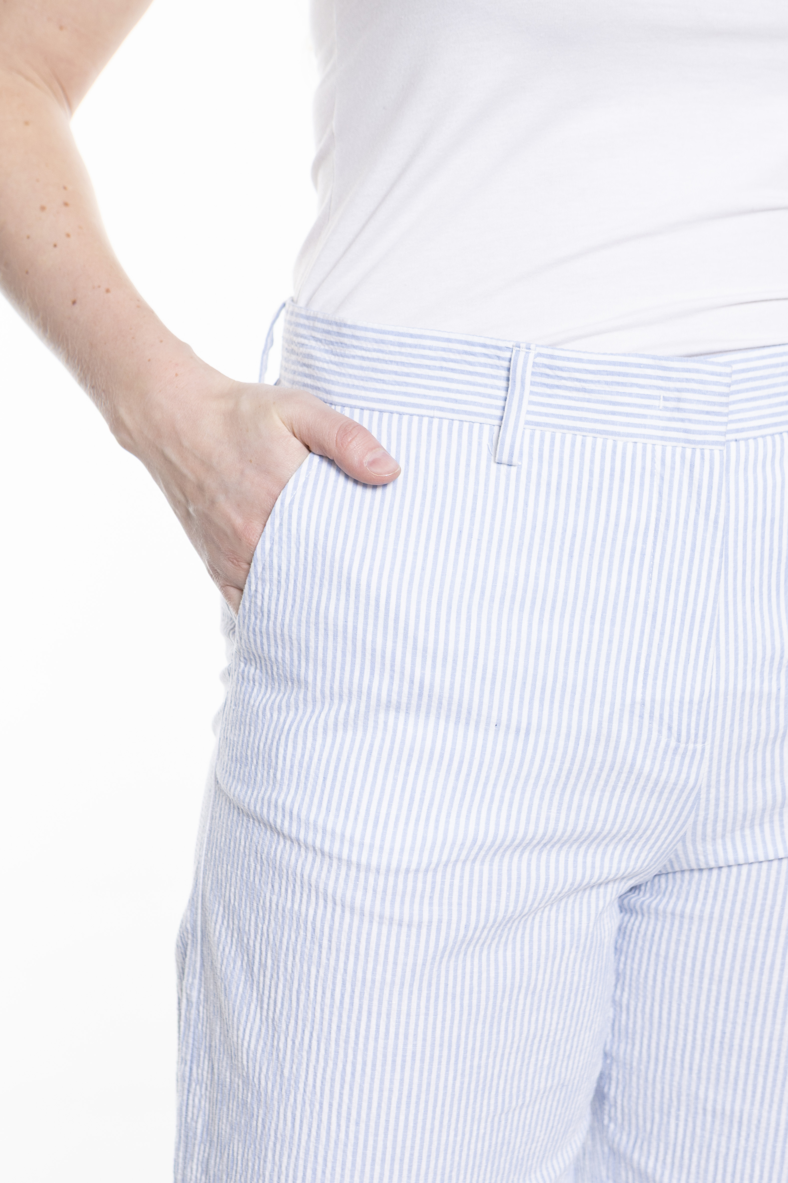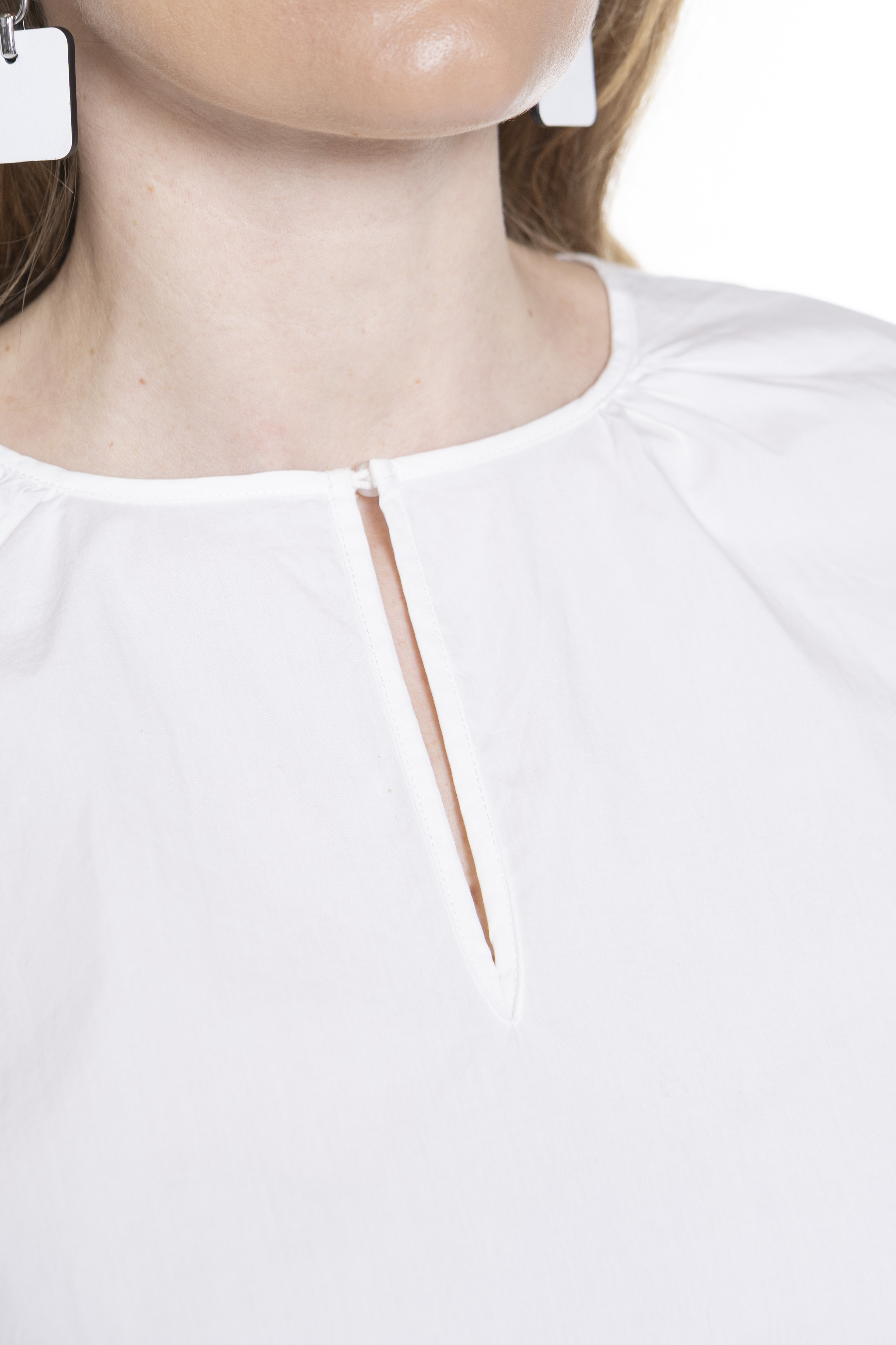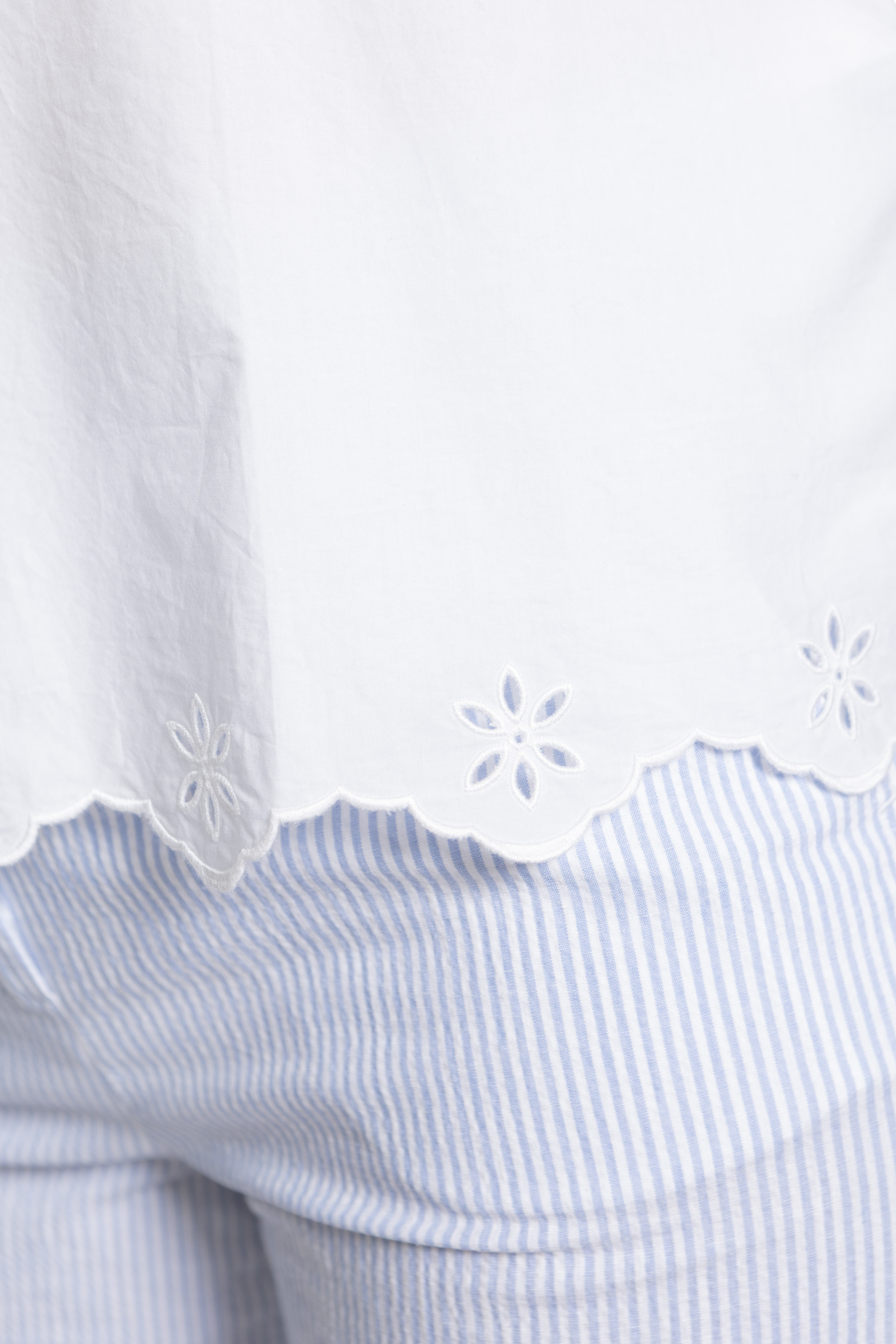 Блузка из поплина из чистого хлопка со спиной из хлопкового джерси. Круглый вырез горловины с каплевидным вырезом спереди и короткие присборенные рукава, украшенные рюшами и вышивкой английской вышивкой.