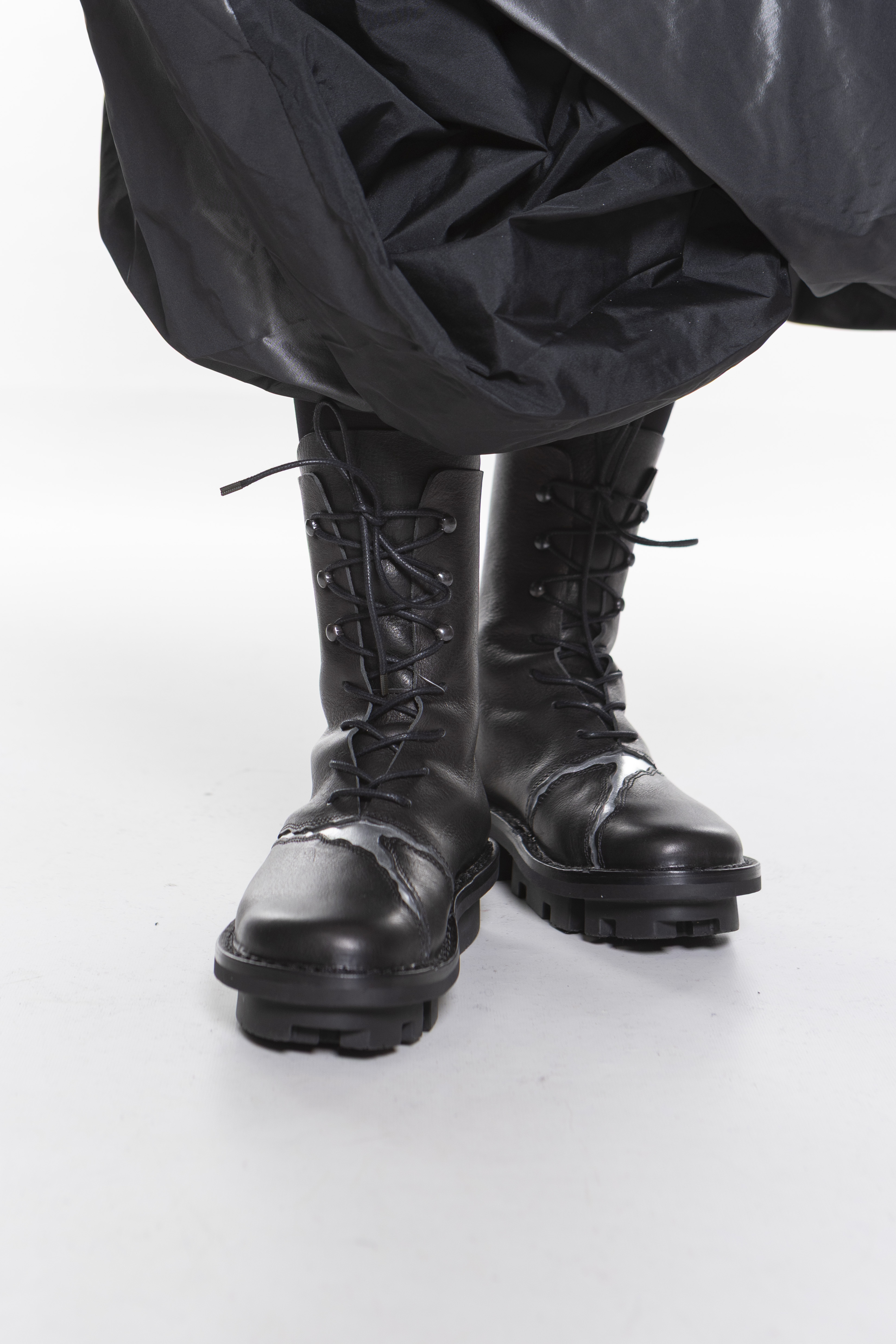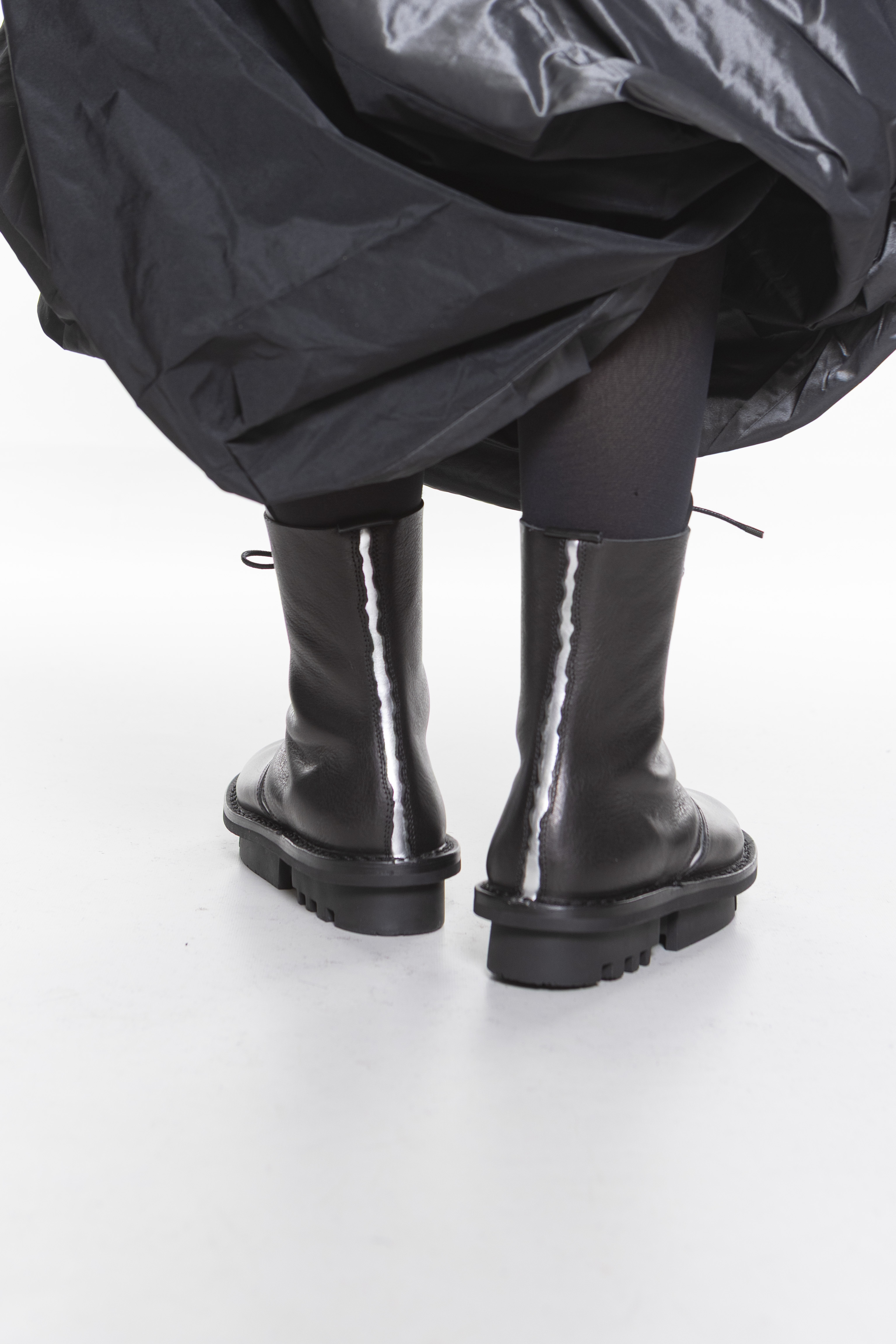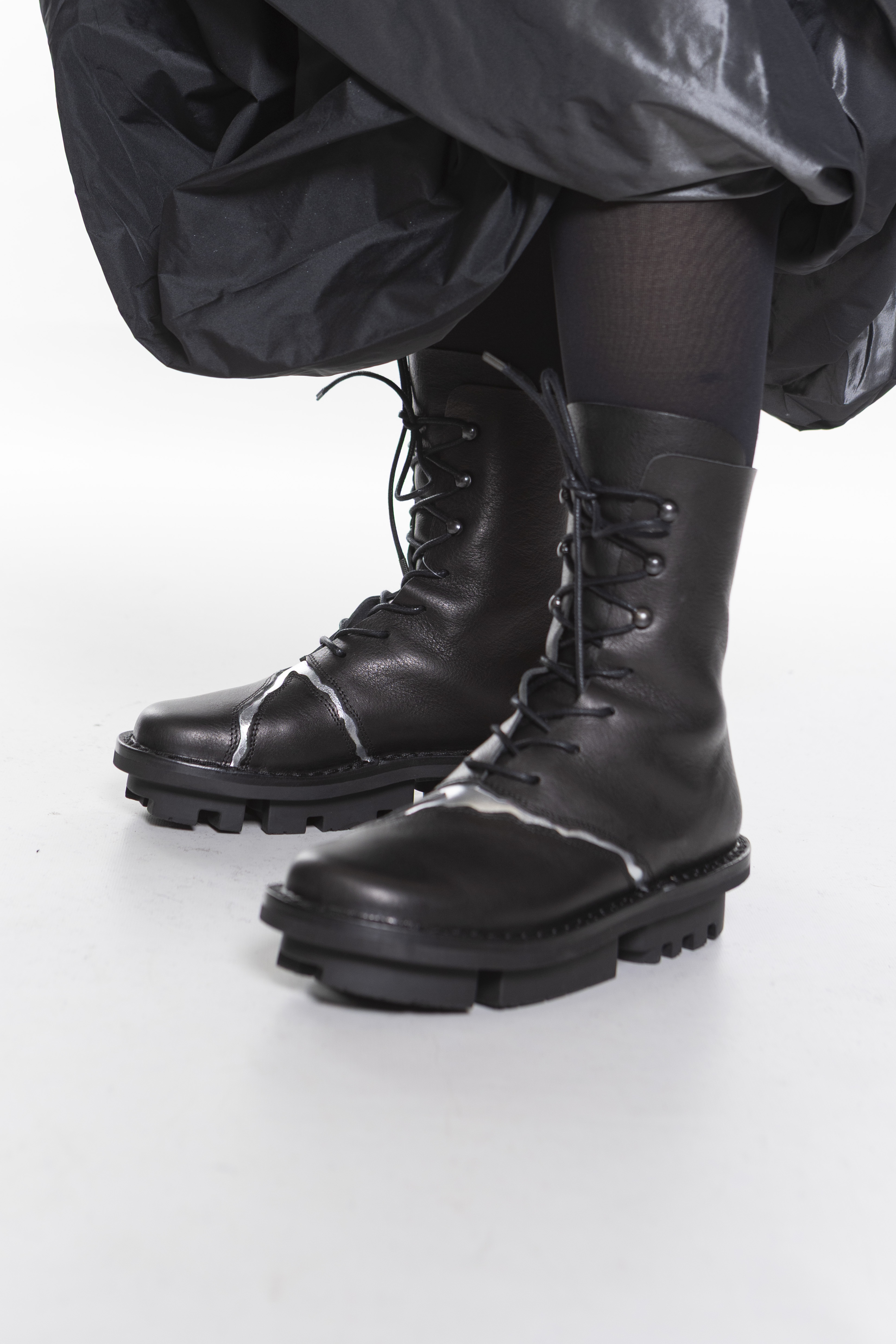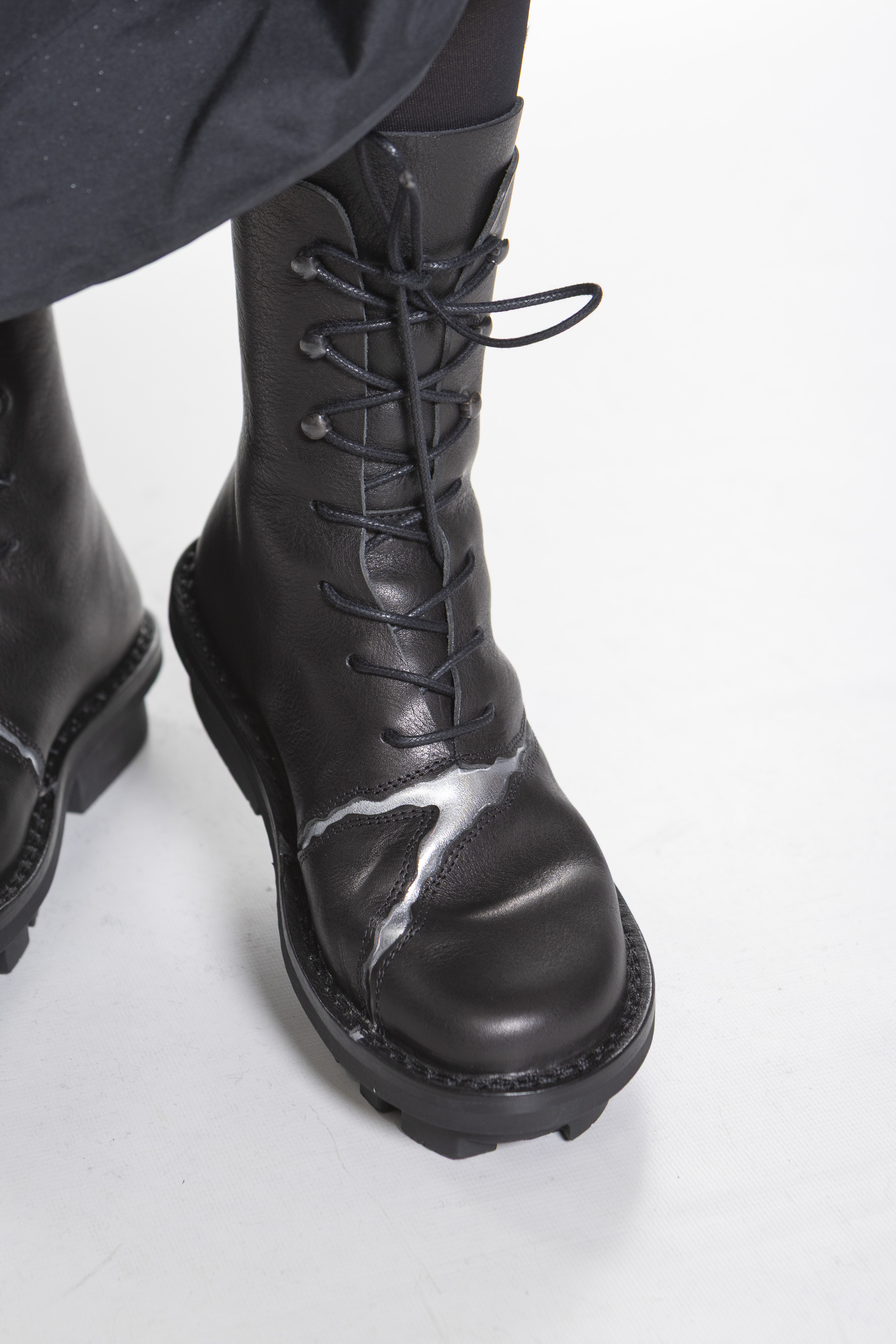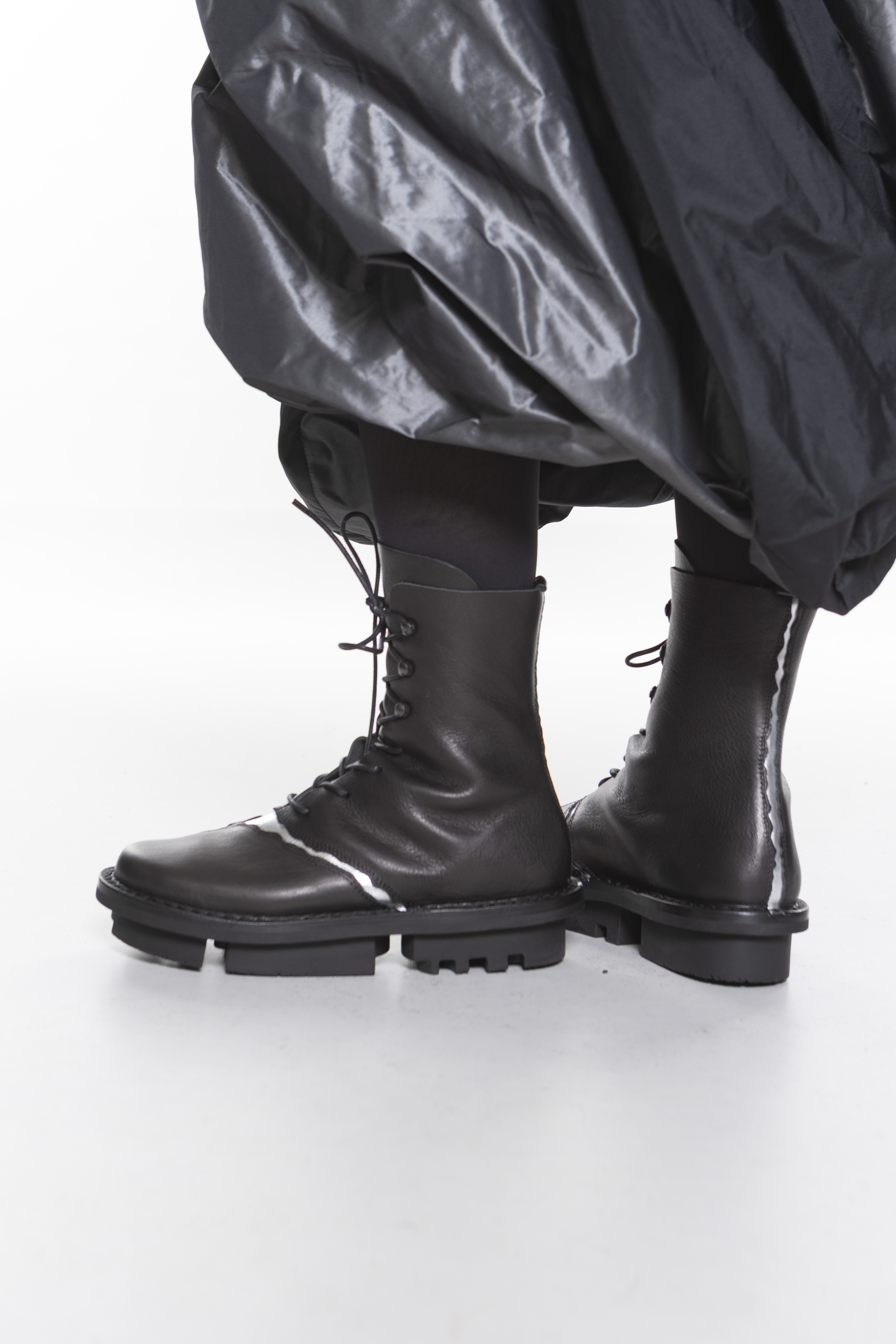 Швы этих средне-высоких ботинок на шнуровке разнесены и подложены контрастными цветами.