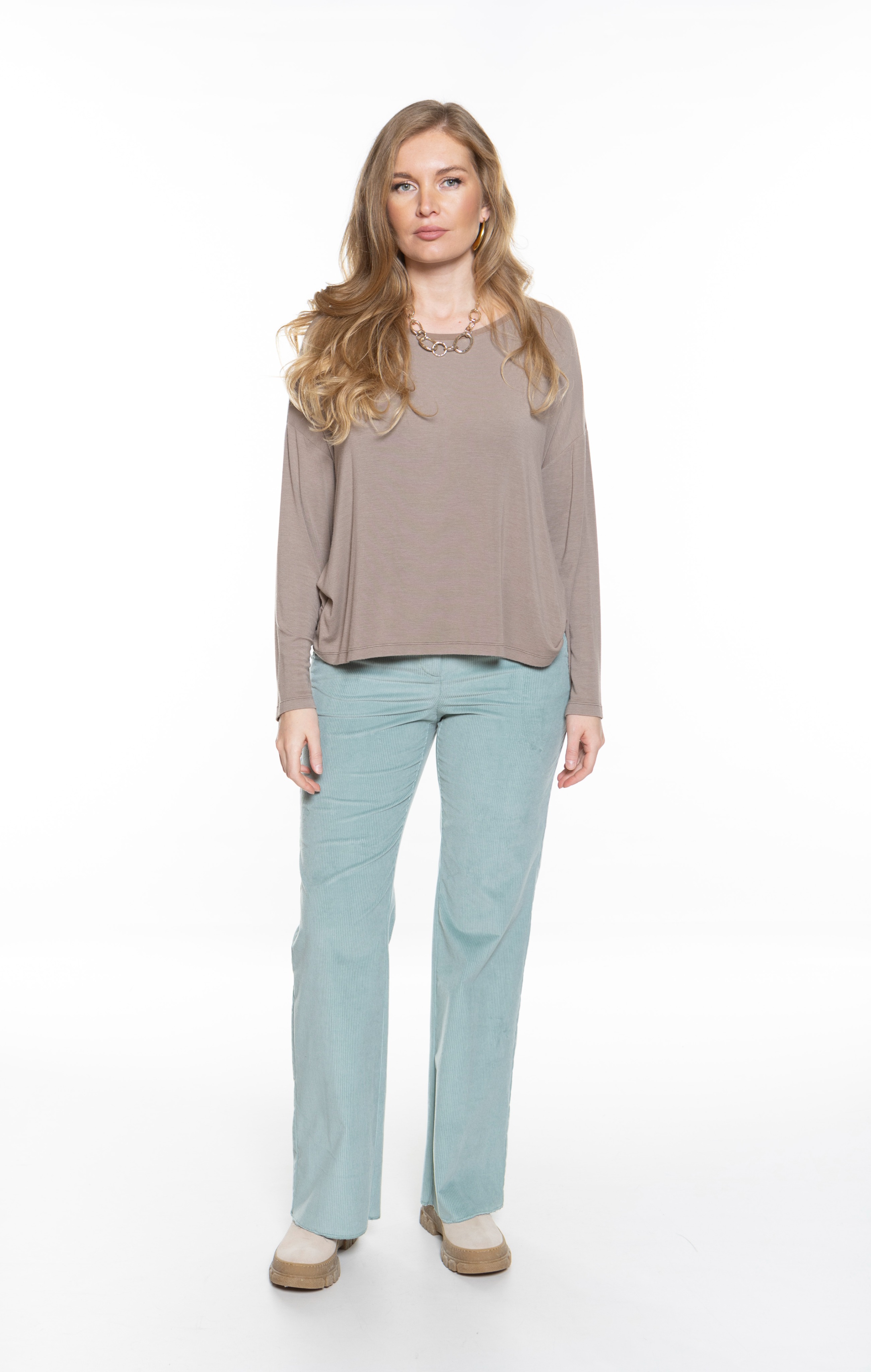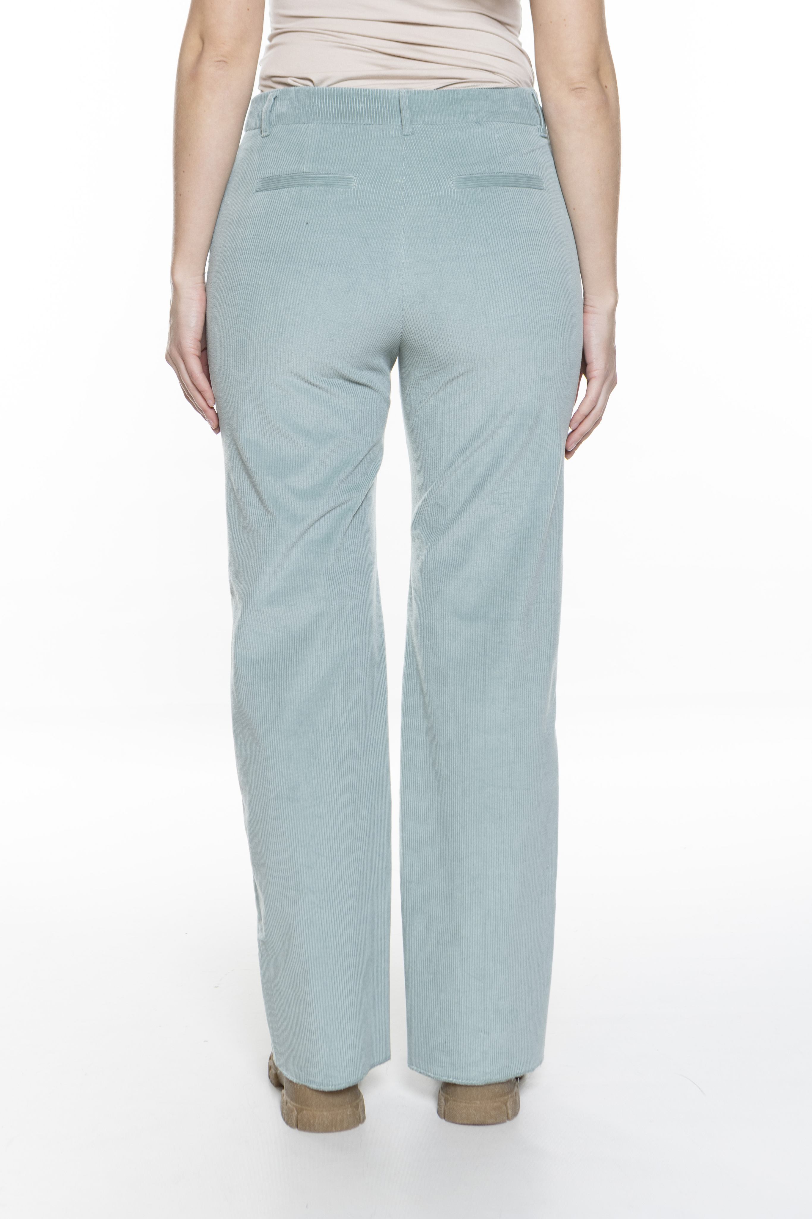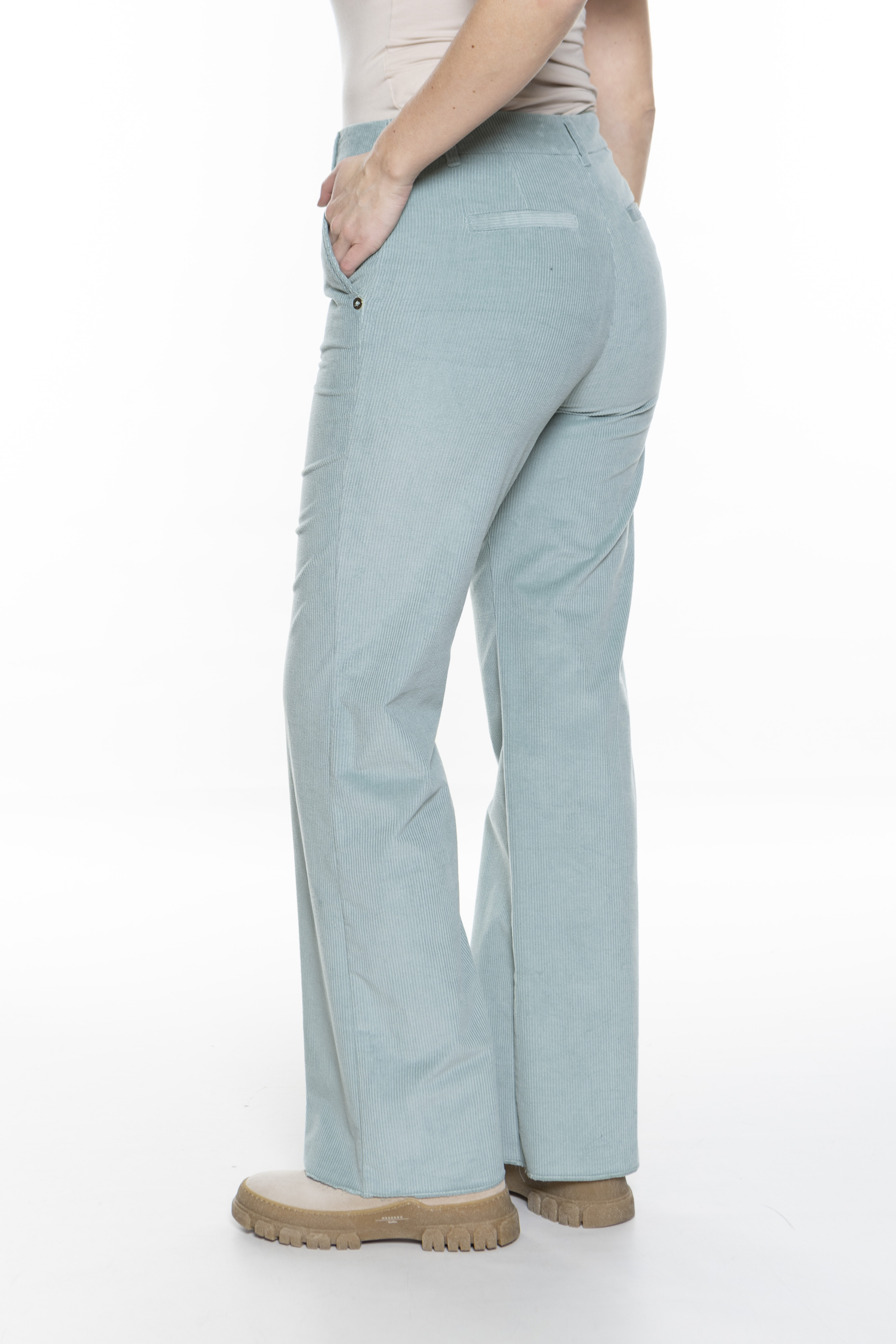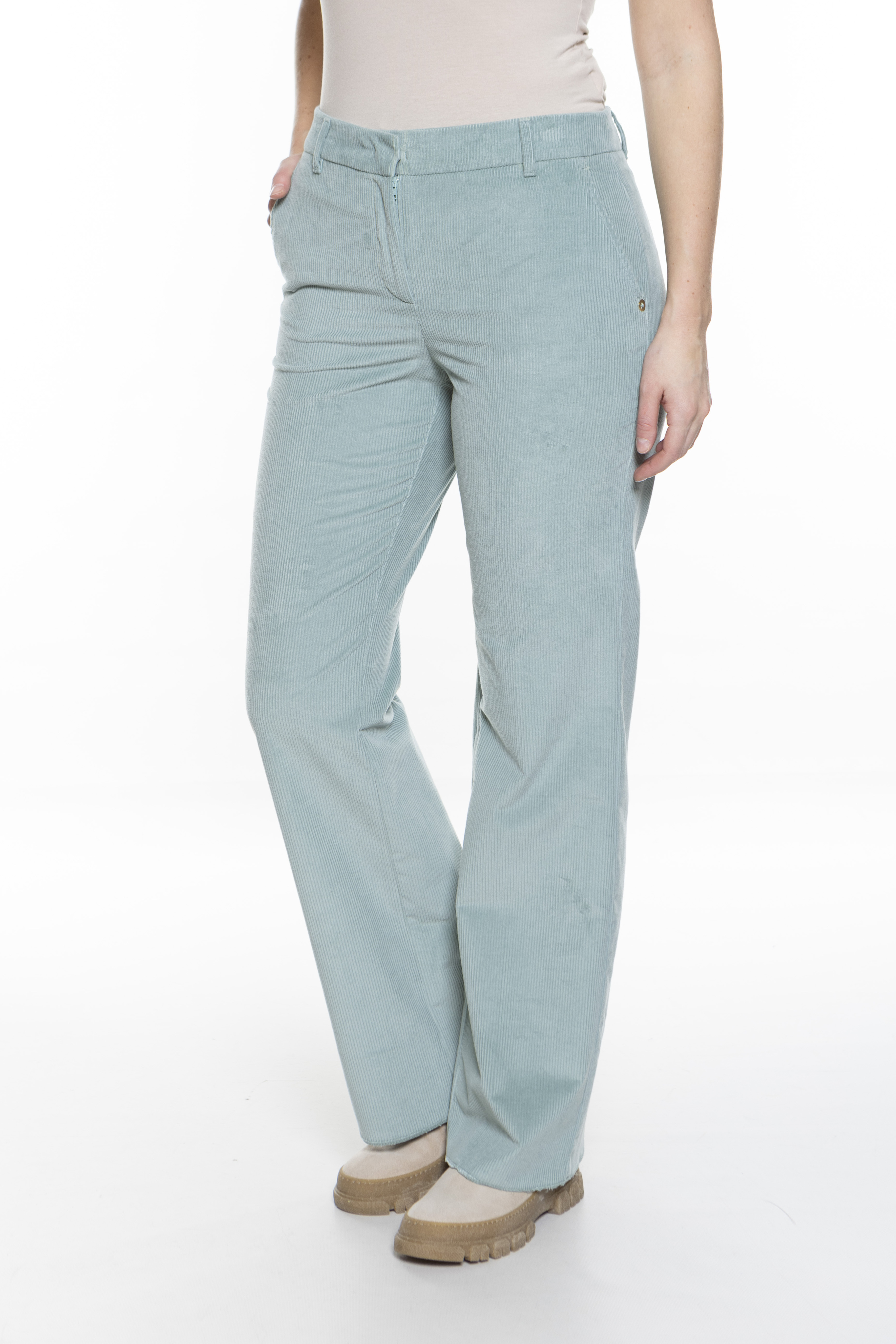 Модель представляет собой брюки из эластичного хлопкового вельвета. Свободный широкий крой с прижатыми складками, средней посадкой на талии и застежкой-молнией. Стиль 70-х и спортивный шик, несомненно, делают эту вещь незаменимой в вашем зимнем гардеробе.