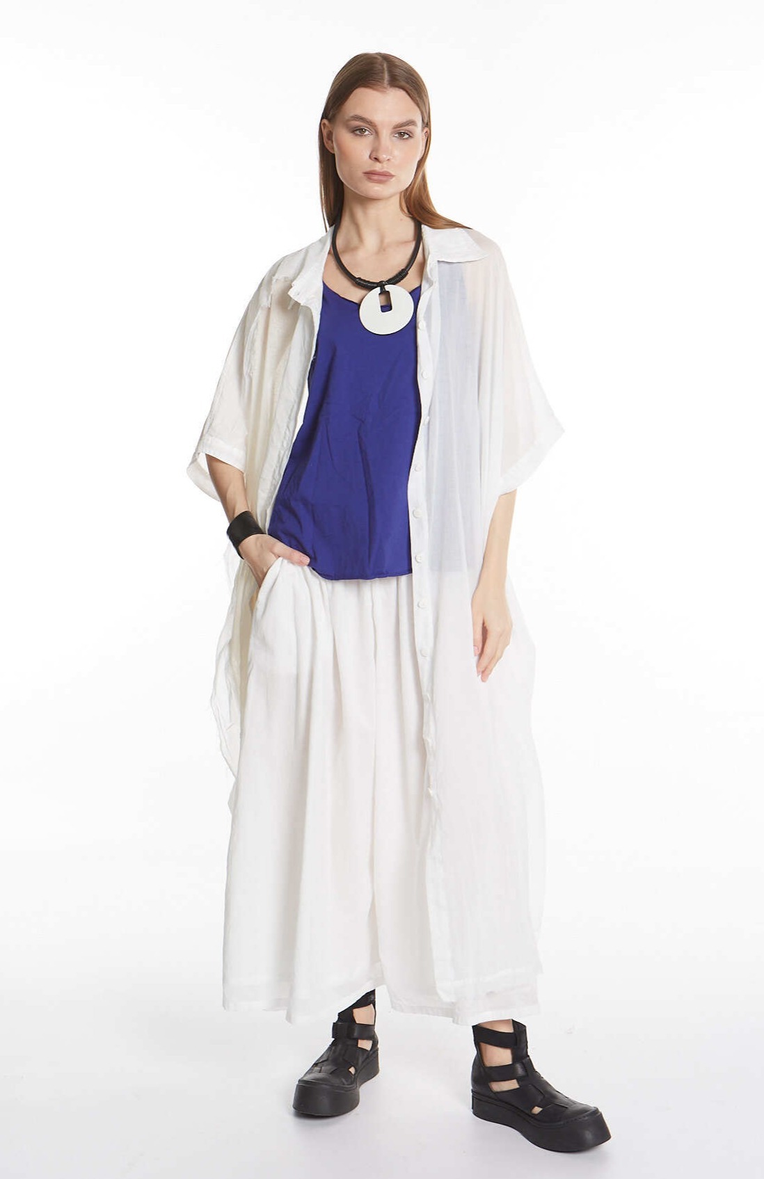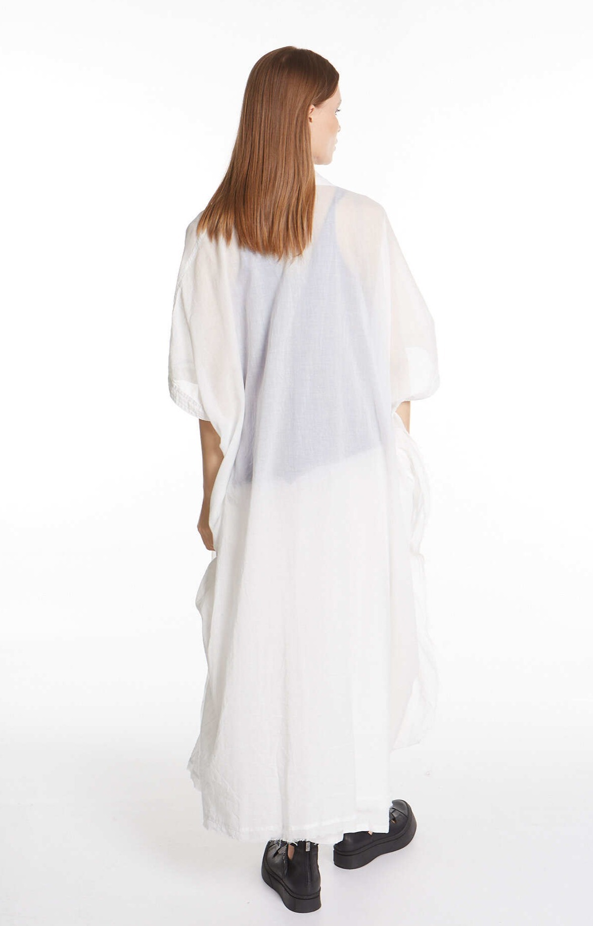 Длинная рубашка оверсайз из смеси мягкой хлопковой вуали и хлопкового кружева. Модель отличается двойным асимметричным воротником и потертыми краями.