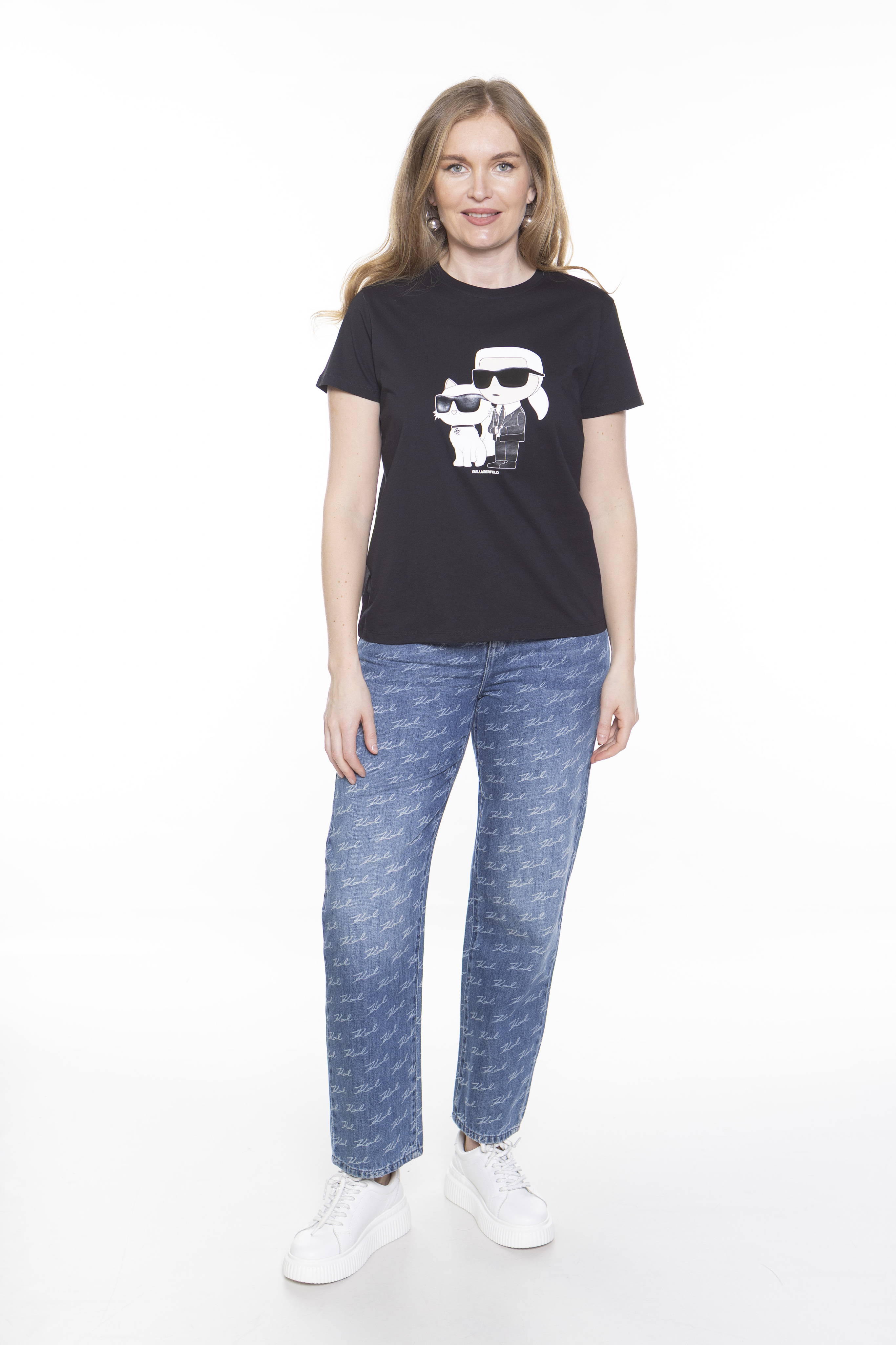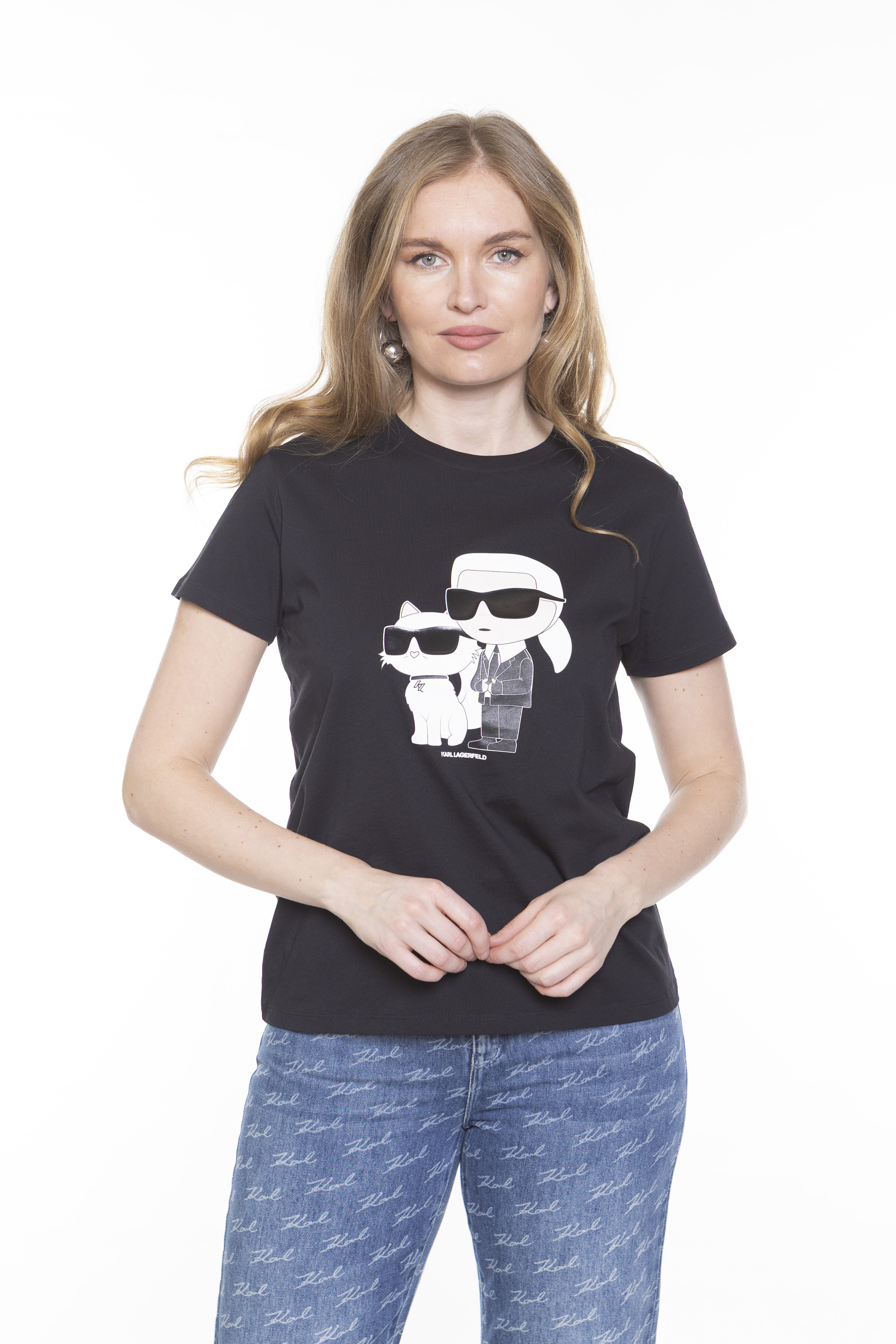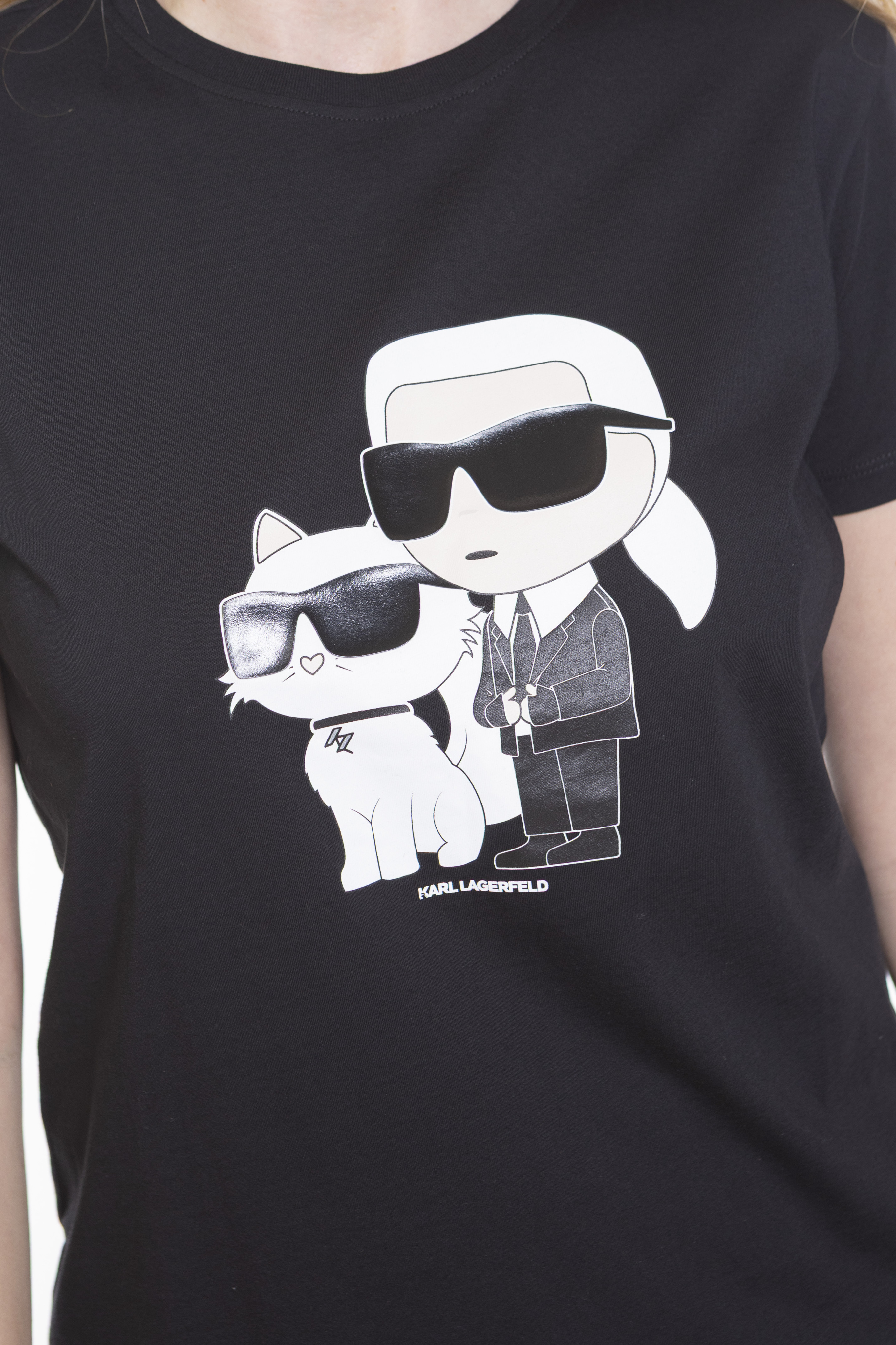 Эта классическая футболка с круглым вырезом изготовлена из органического хлопка и украшена графикой Ikonik Karl и Choupette нового поколения с плотным принтом на груди.