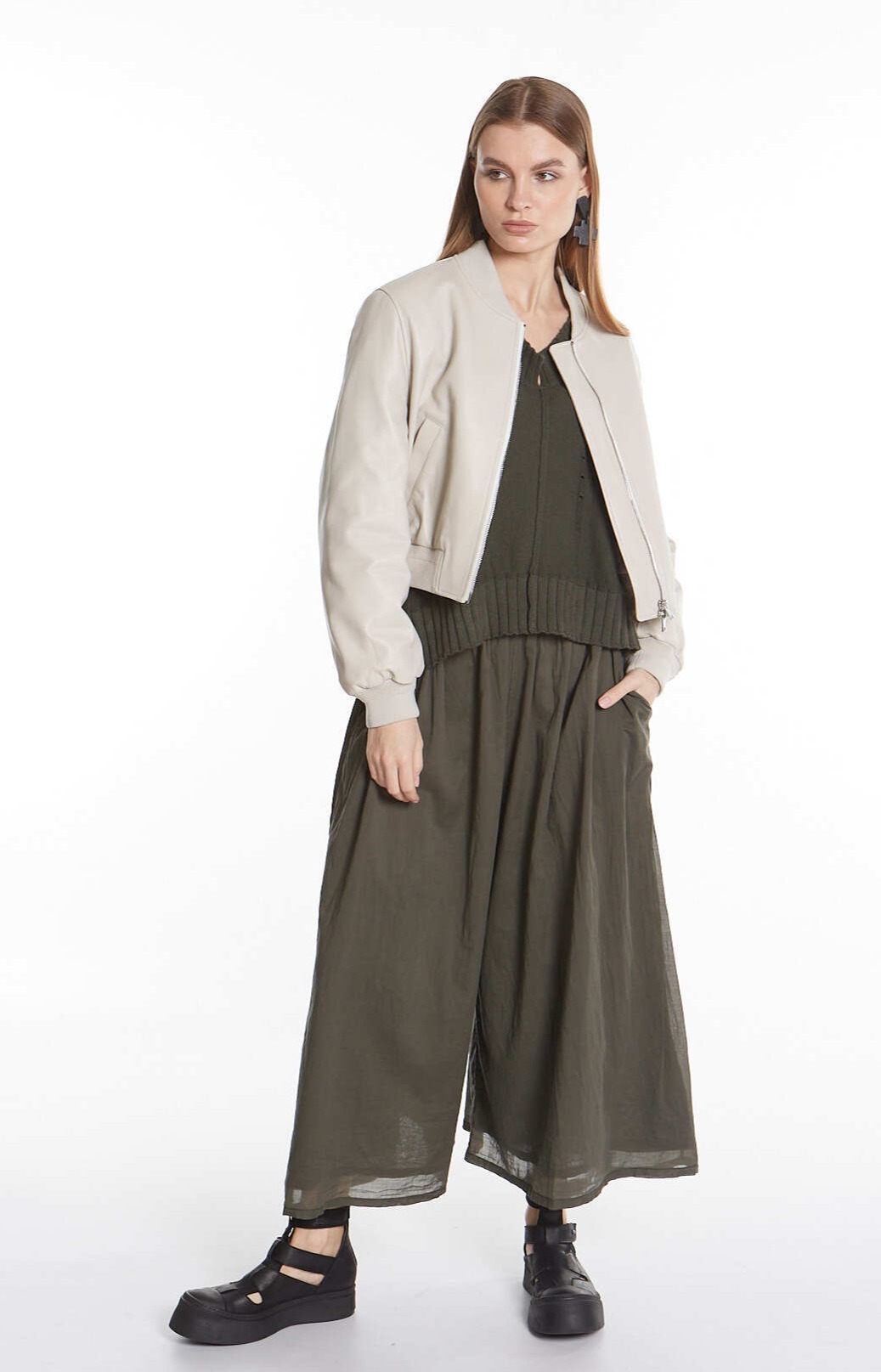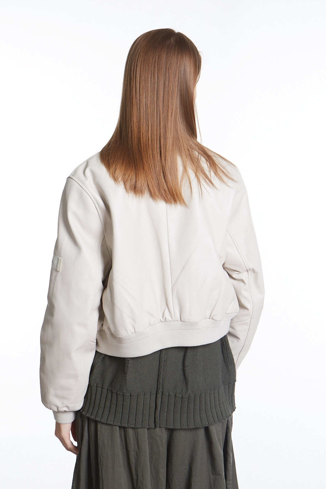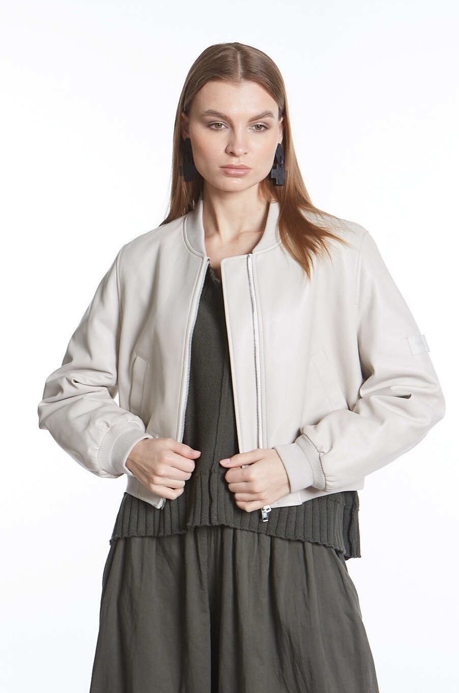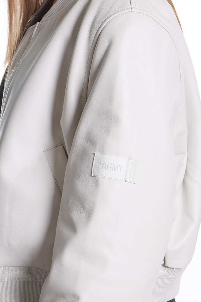 Светло-серый бомбер с двумя врезными карманами дополнен воротником, широким поясом и манжетами из меланжевого трикотажа. Куртка, застегивающаяся встречной молнией, сшита вручную из мягкой матовой кожи тонкой выделки.