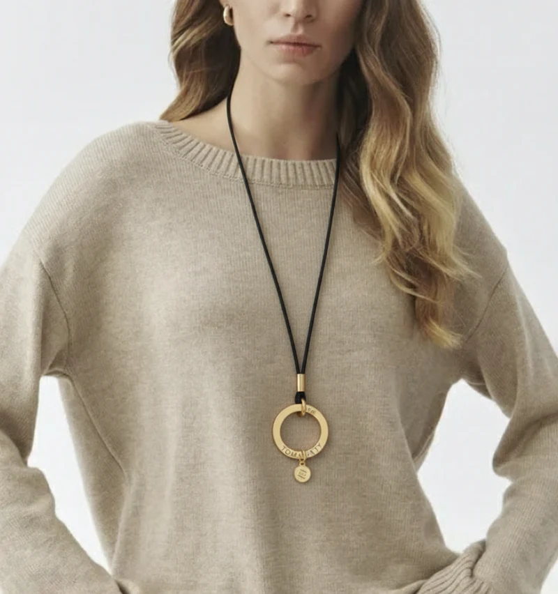 Ожерелье на тонком шнурке из экокожи с кольцом золотого цвета, длина 70 см, диаметр кольца 4 см.