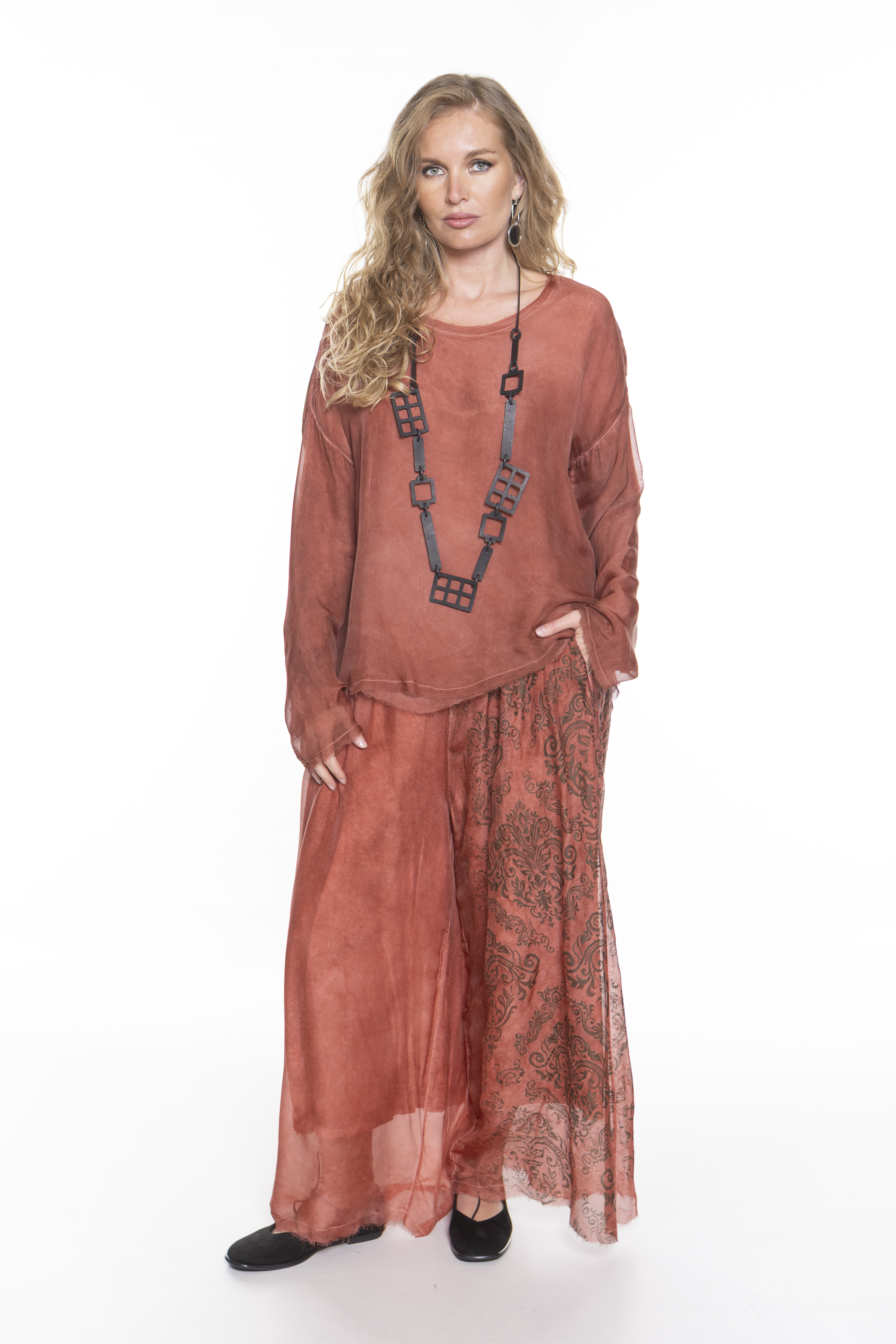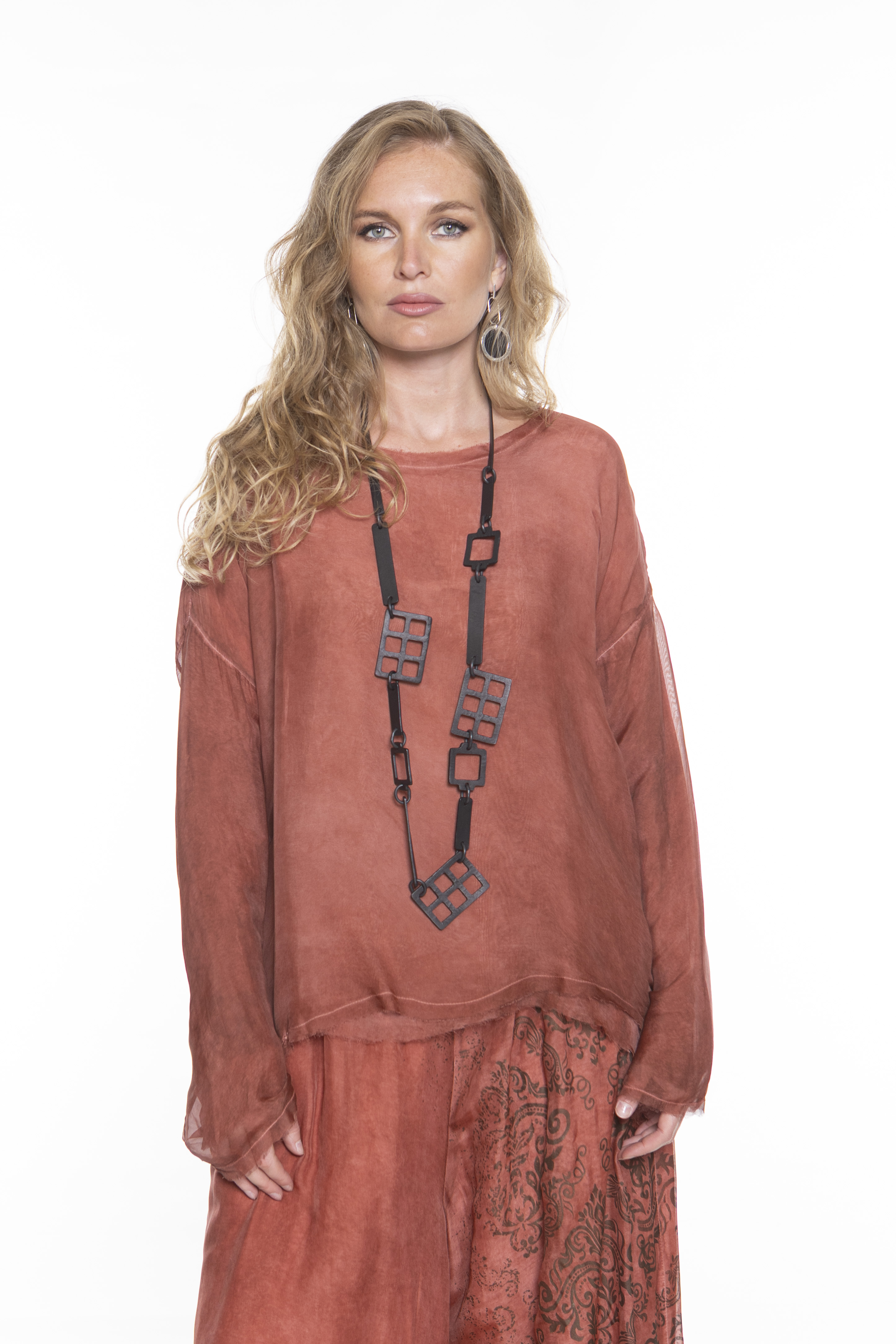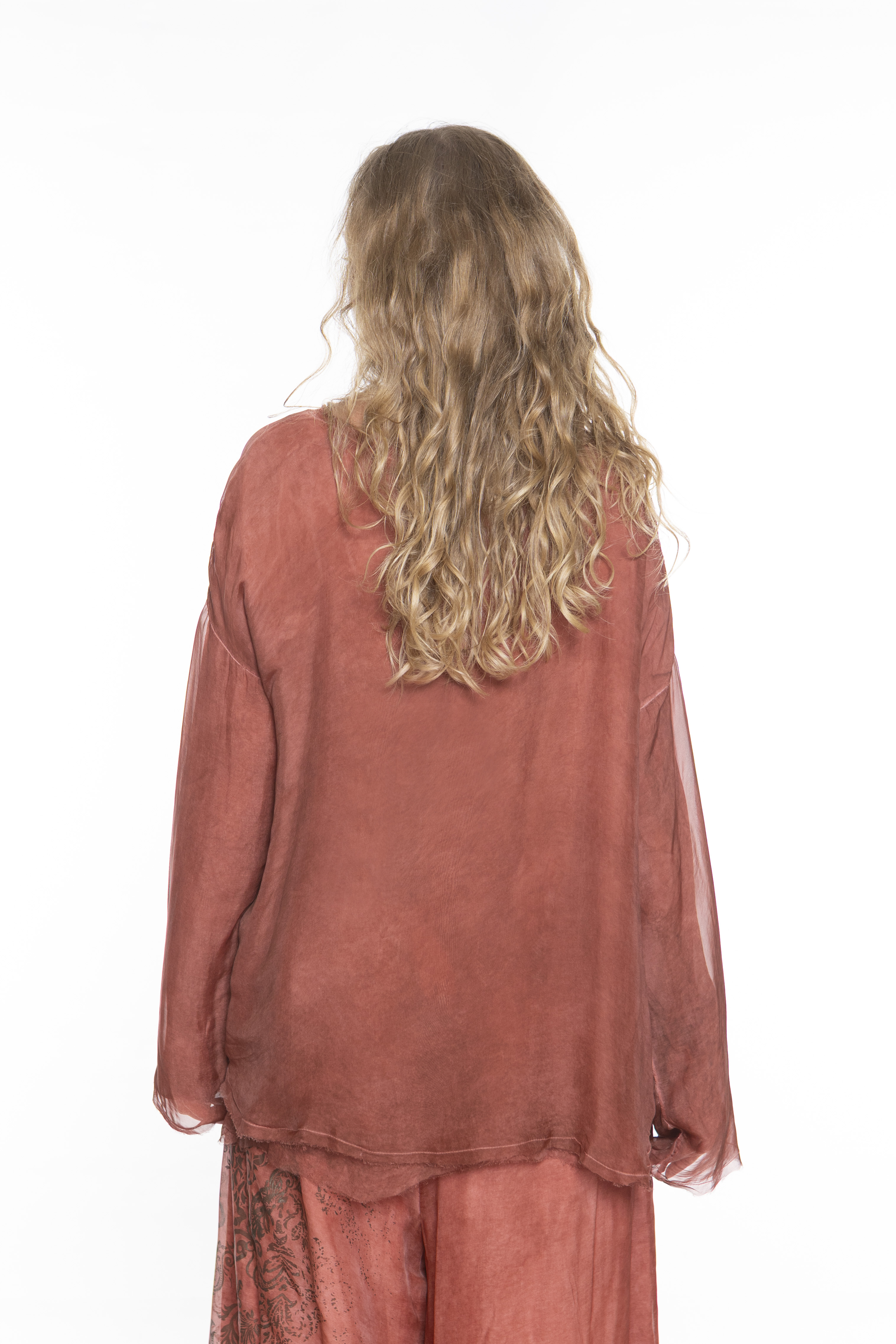 Свободная блуза с длинными рукавами и круглым вырезом, изготовленная из двухслойной шелково-вискозной ткани.