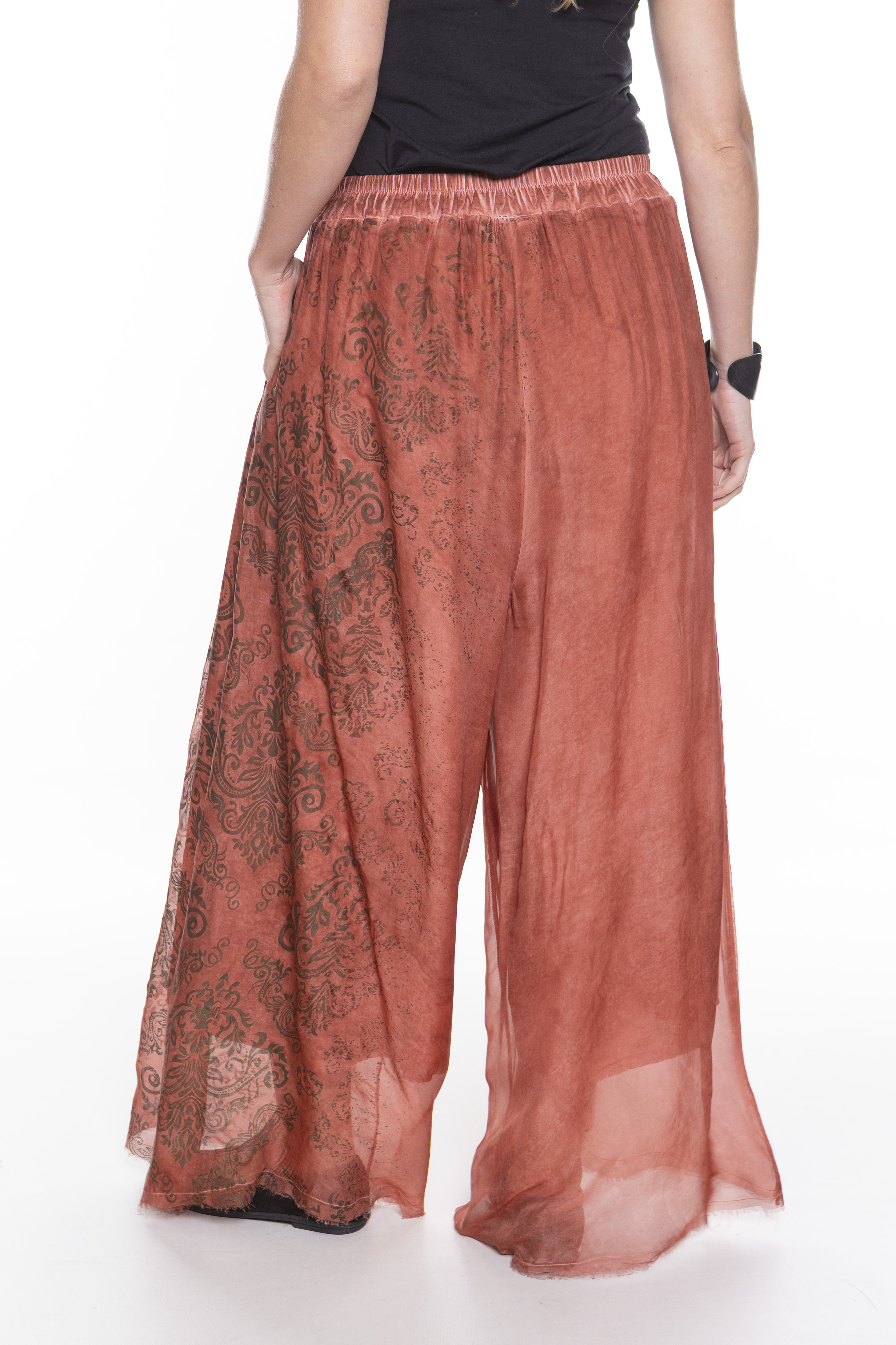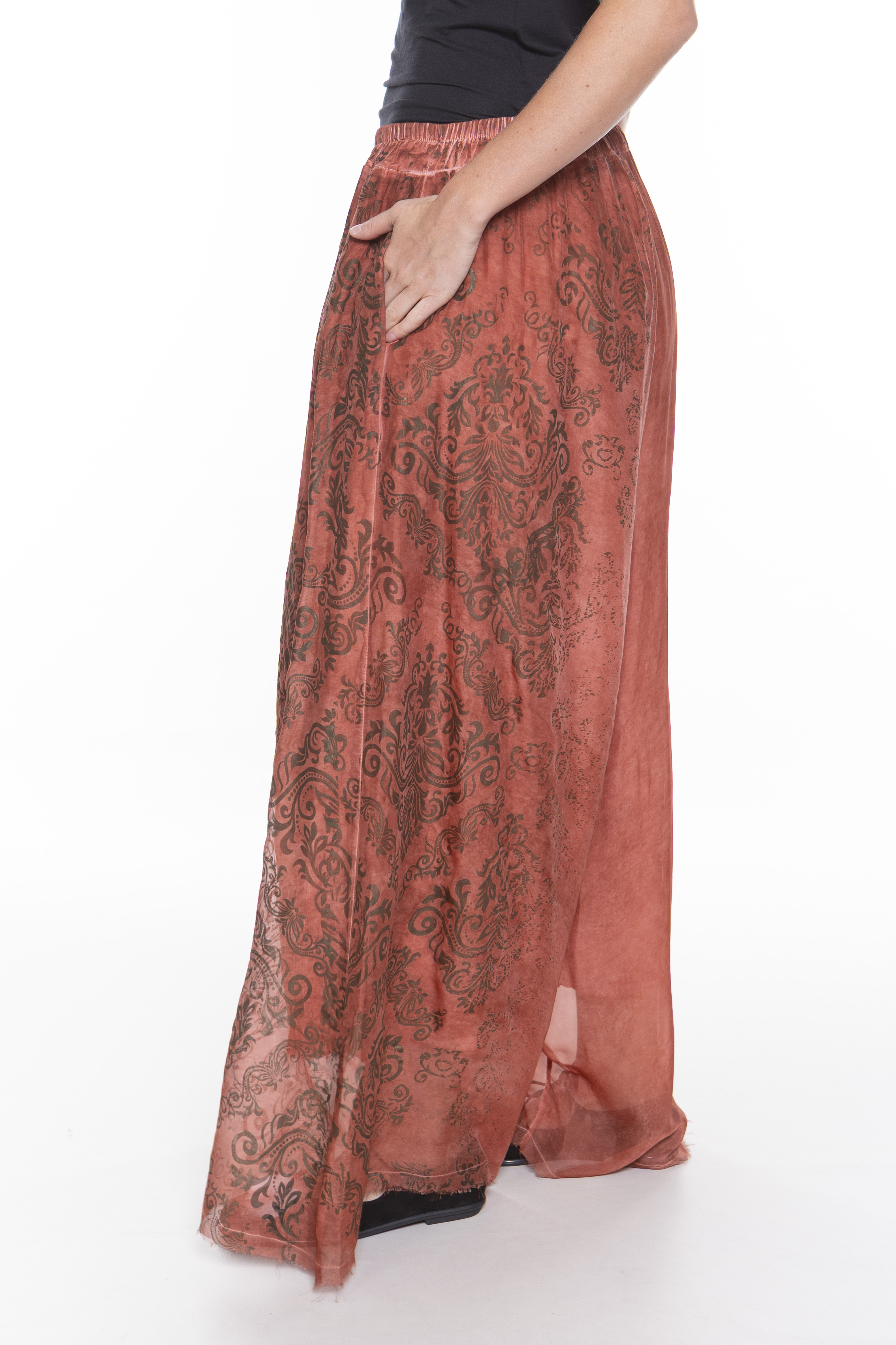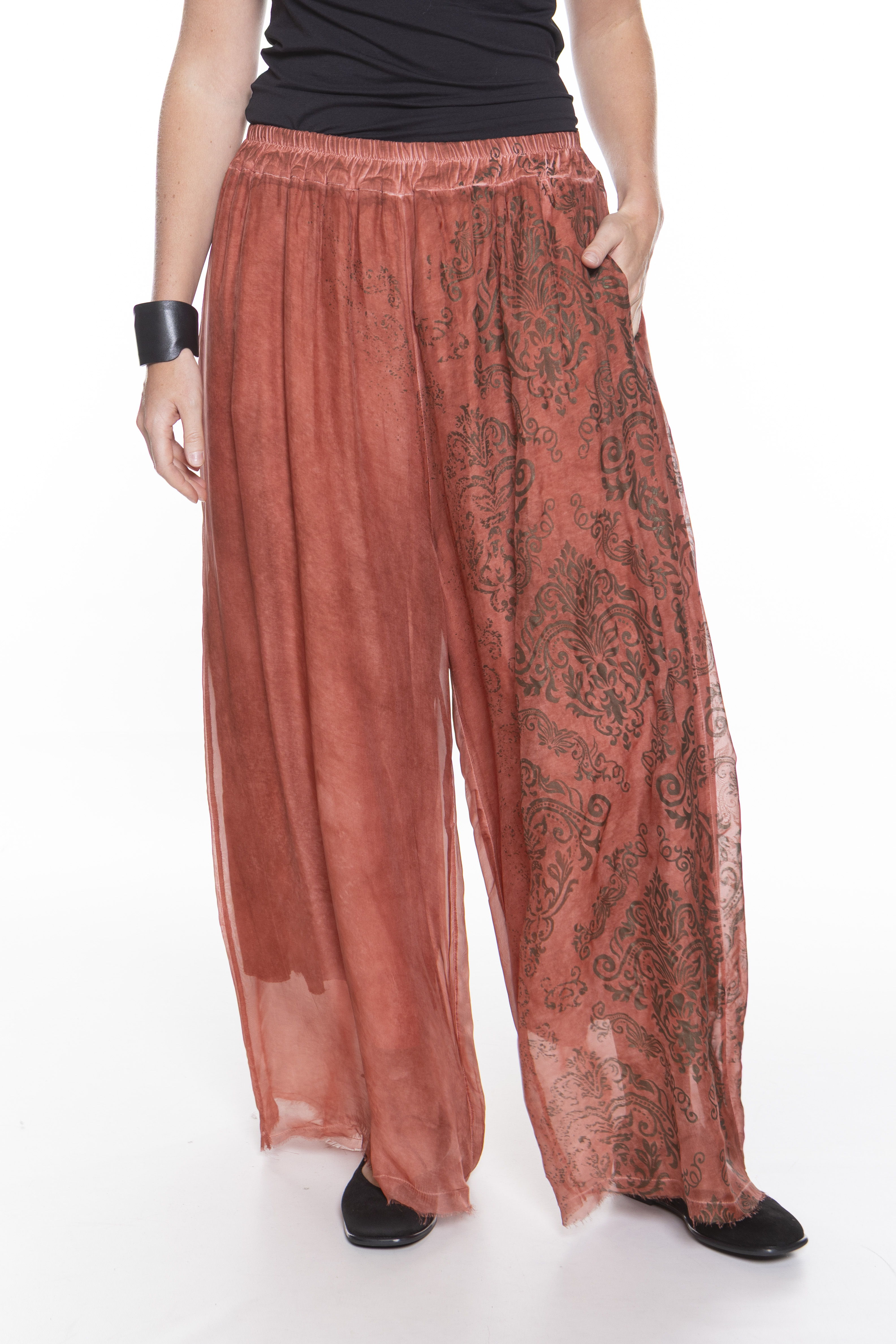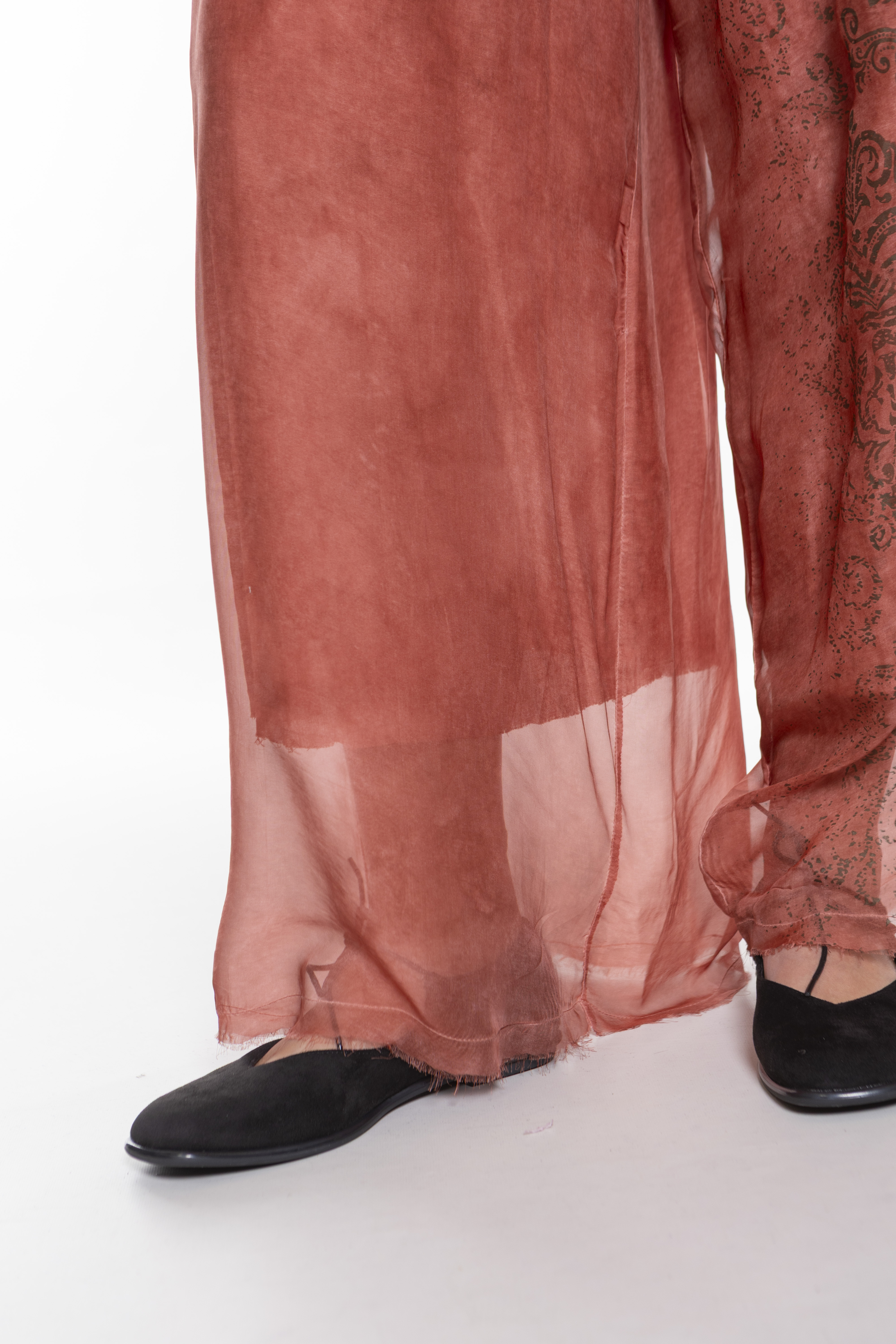 Свободная блуза с длинными рукавами и круглым вырезом, изготовленная из двухслойной шелково-вискозной ткани.