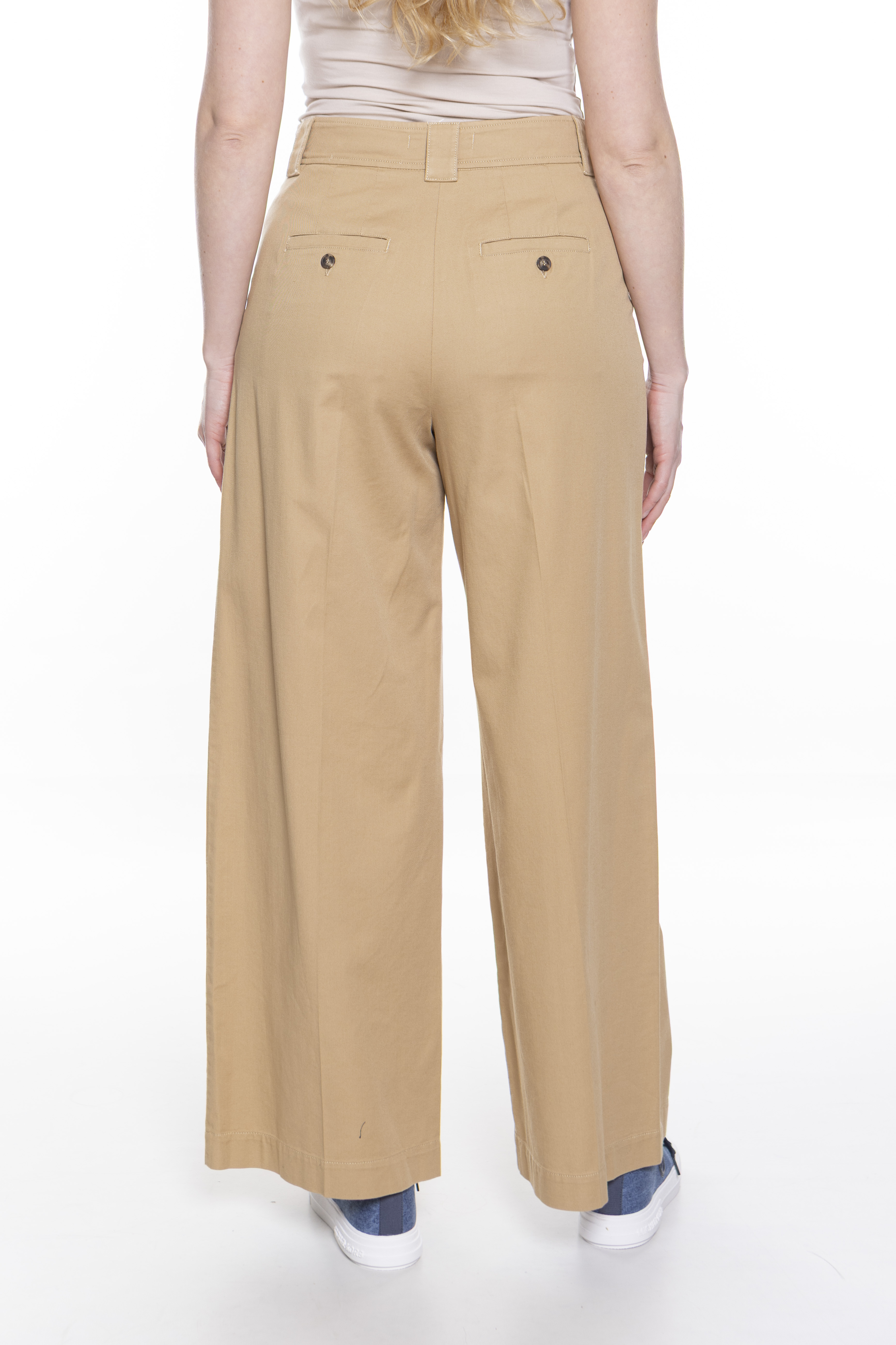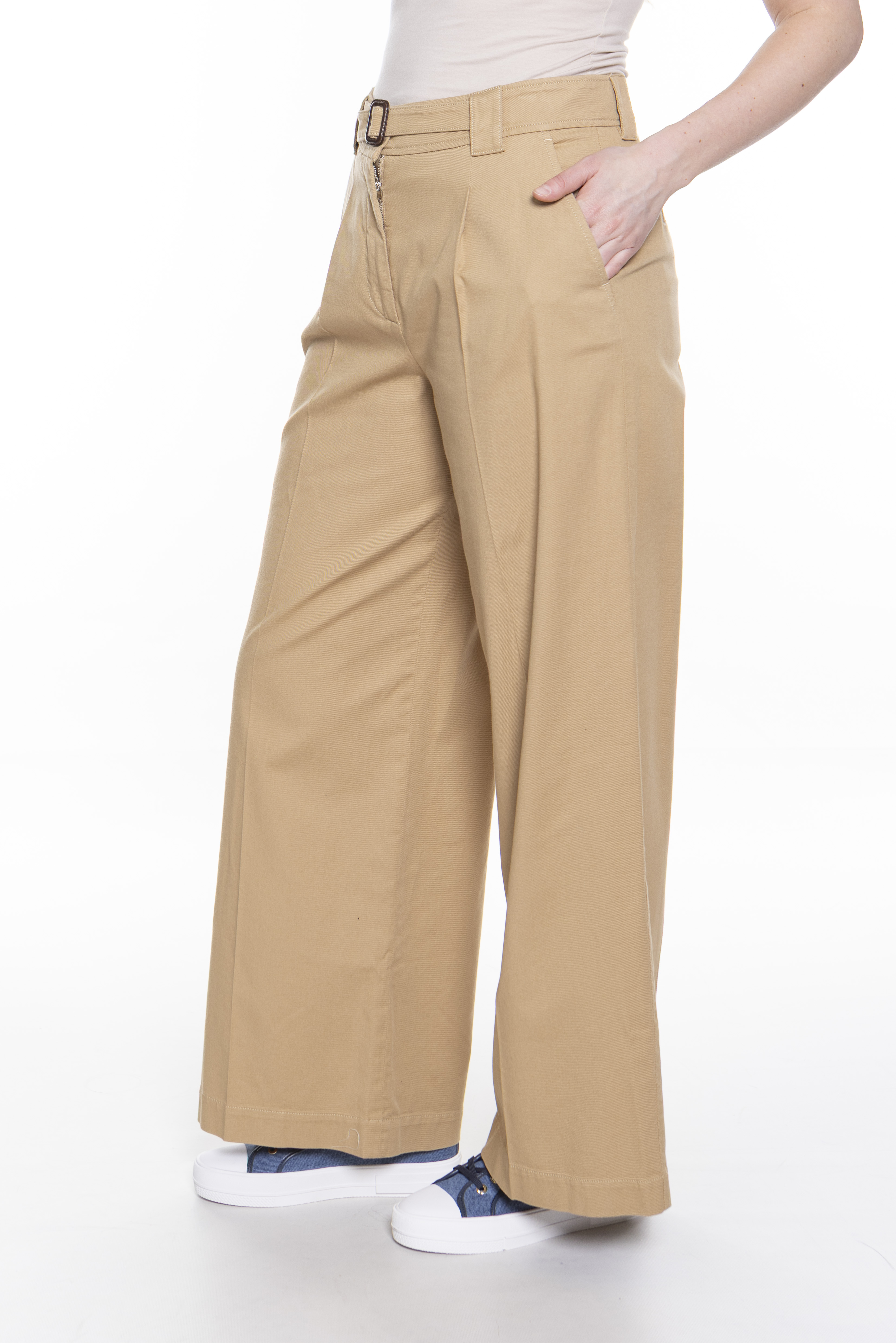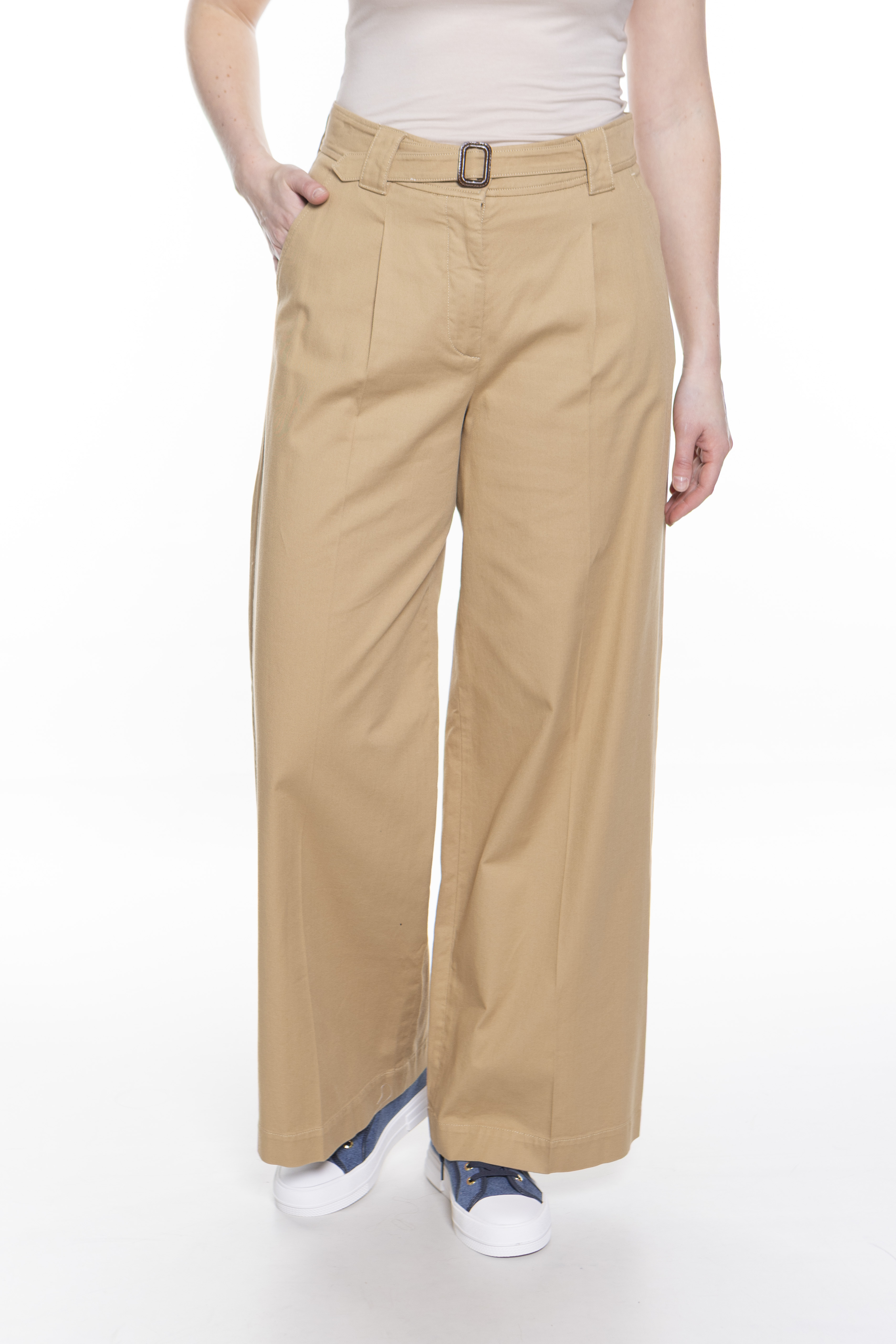 Широкие брюки из хлопчатобумажной ткани. Модель струящегося силуэта с вытачками на талии спереди, прорезными карманами по бокам и карманами на пуговицах сзади. Талия подчеркнута ремешком с пряжкой, которую можно снять для более повседневного образа. Застежка с высоким поясом, молния с клапаном и пуговицей.