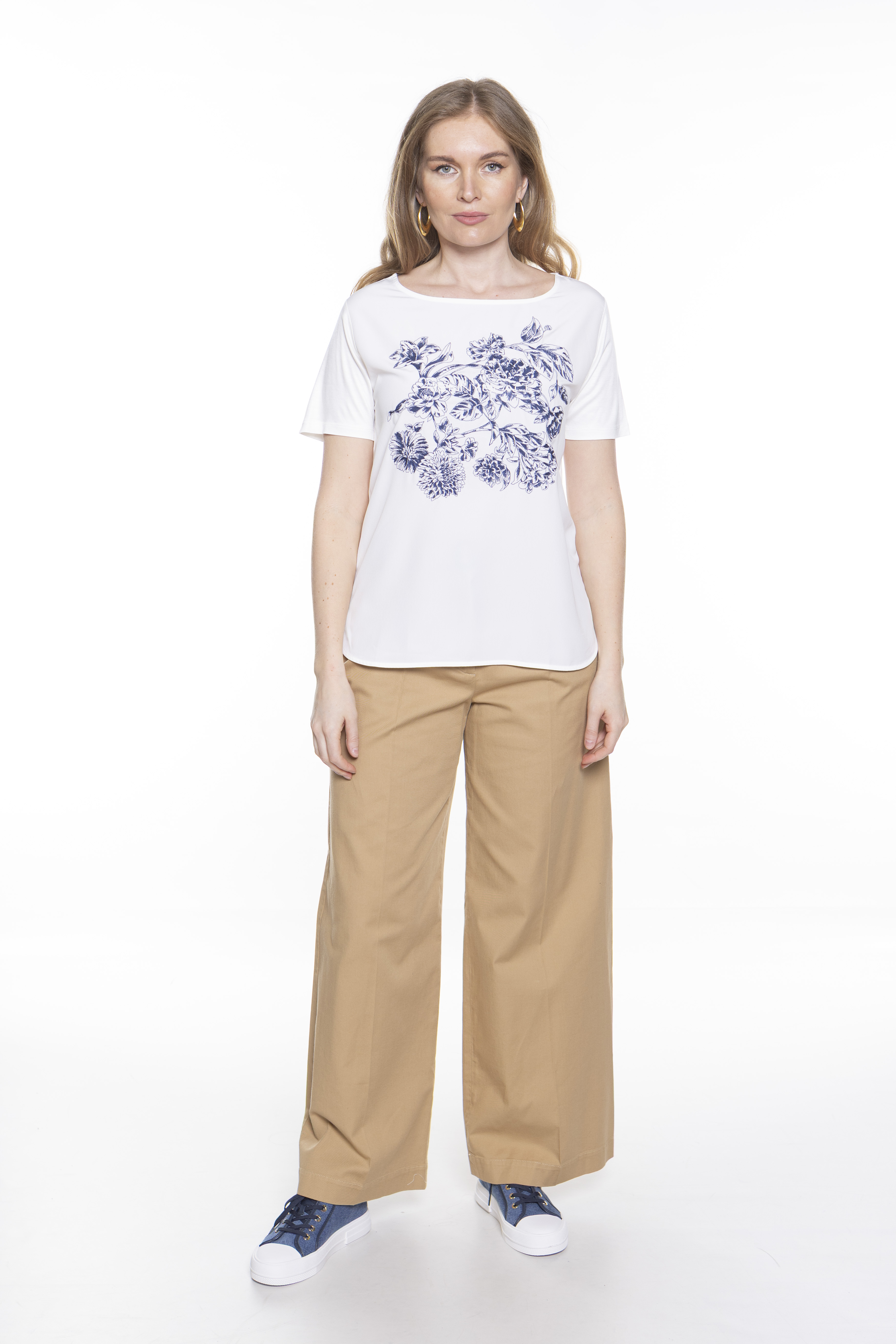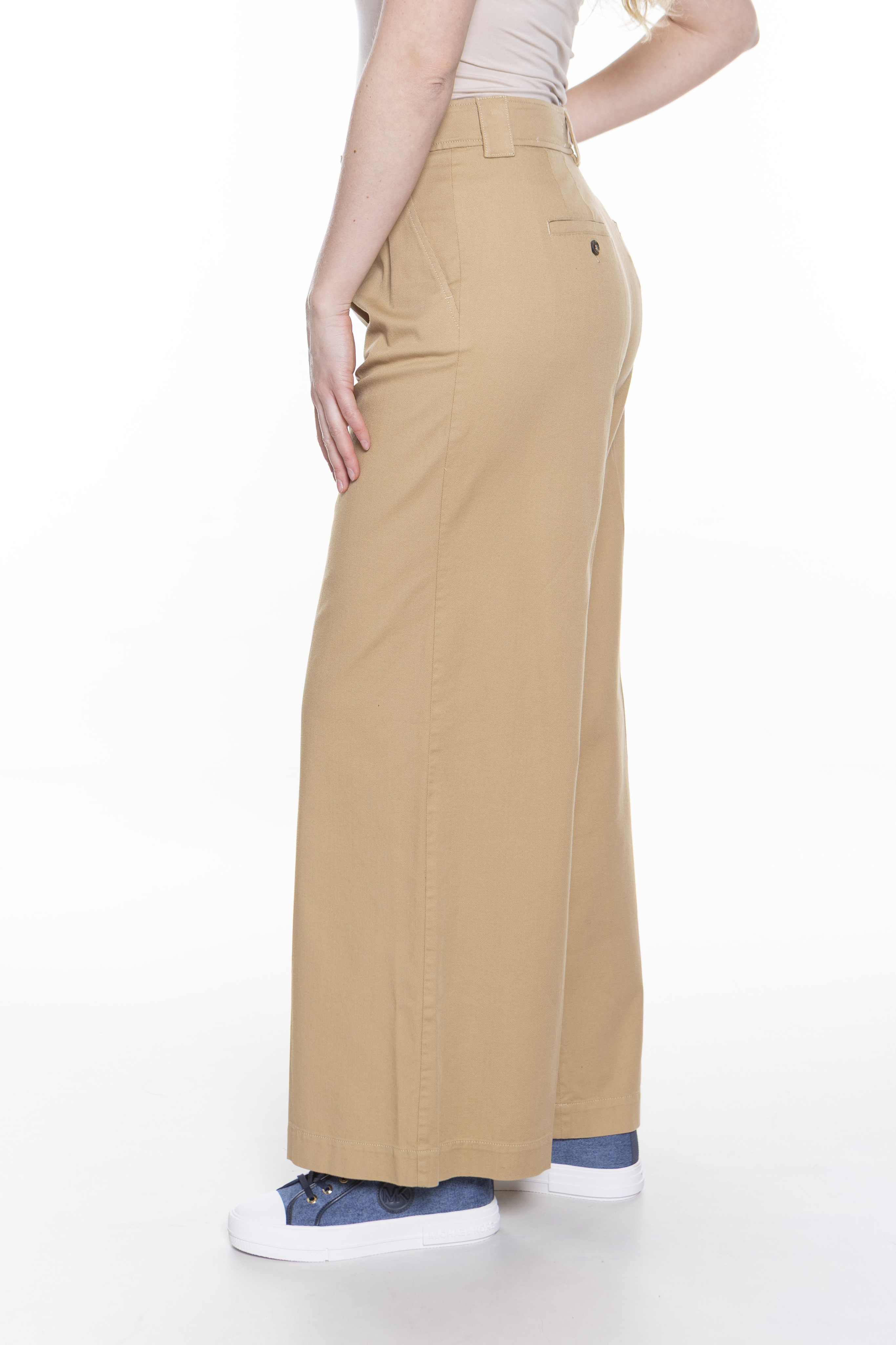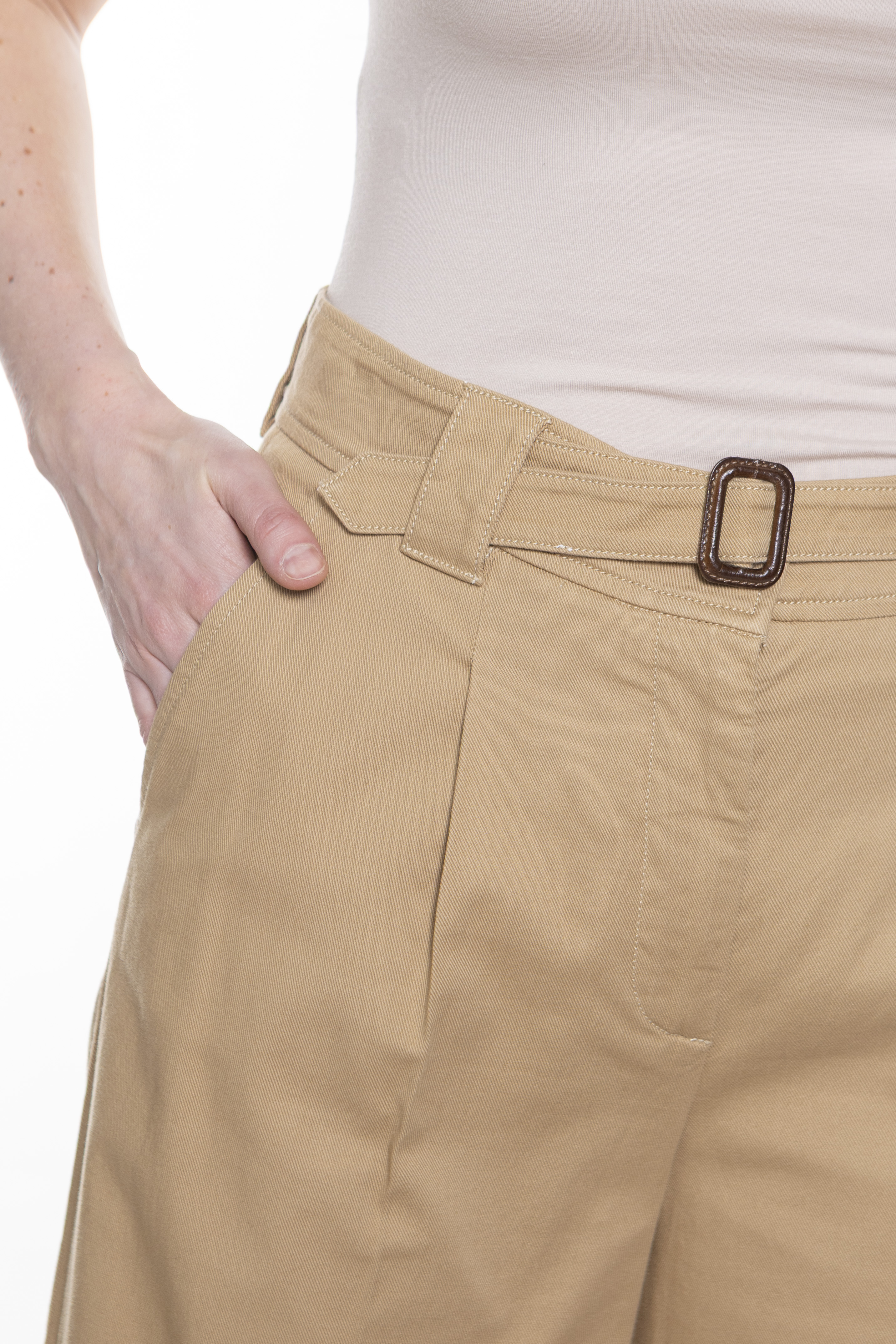 Широкие брюки из хлопчатобумажной ткани. Модель струящегося силуэта с вытачками на талии спереди, прорезными карманами по бокам и карманами на пуговицах сзади. Талия подчеркнута ремешком с пряжкой, которую можно снять для более повседневного образа. Застежка с высоким поясом, молния с клапаном и пуговицей.
