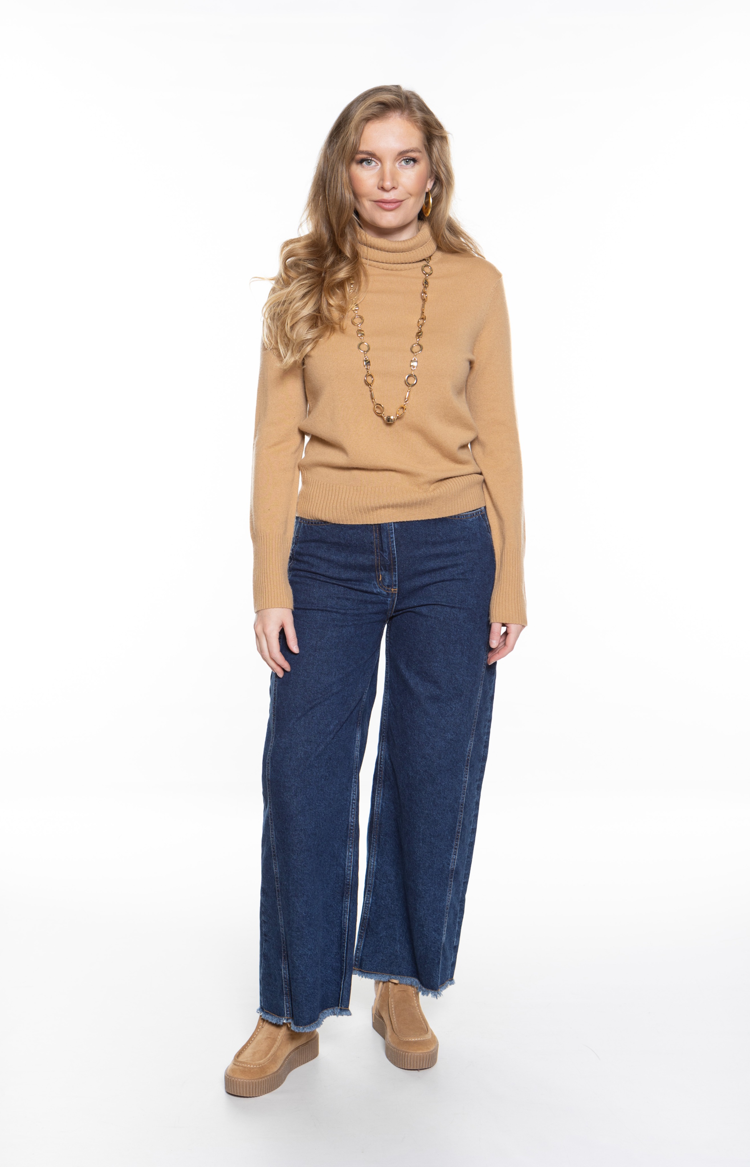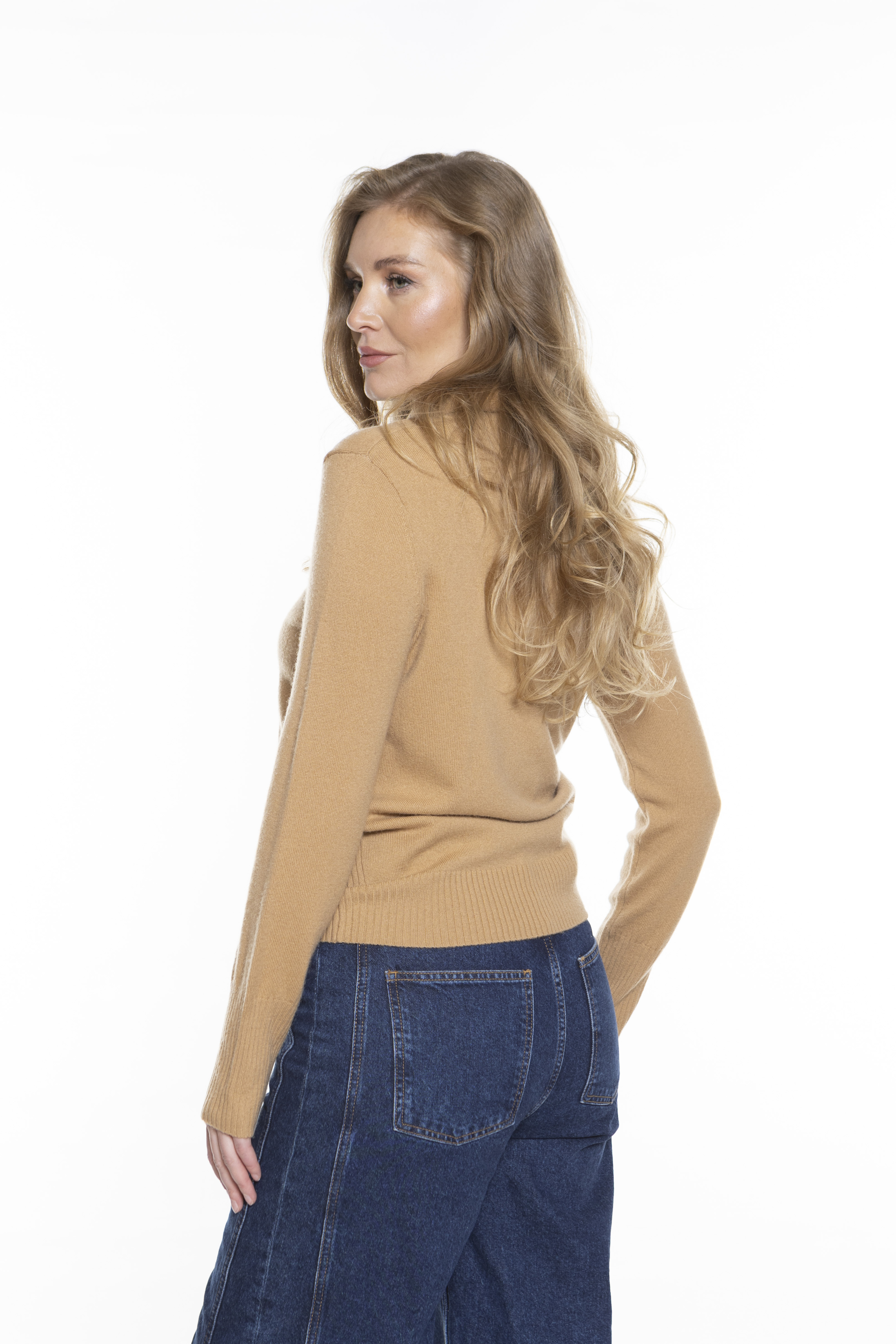 Свитер-поло из смеси шерсти и кашемира. Приталенная модель может похвастаться высоким воротником и длинными рукавами. Боковые стороны украшены ребристыми деталями.