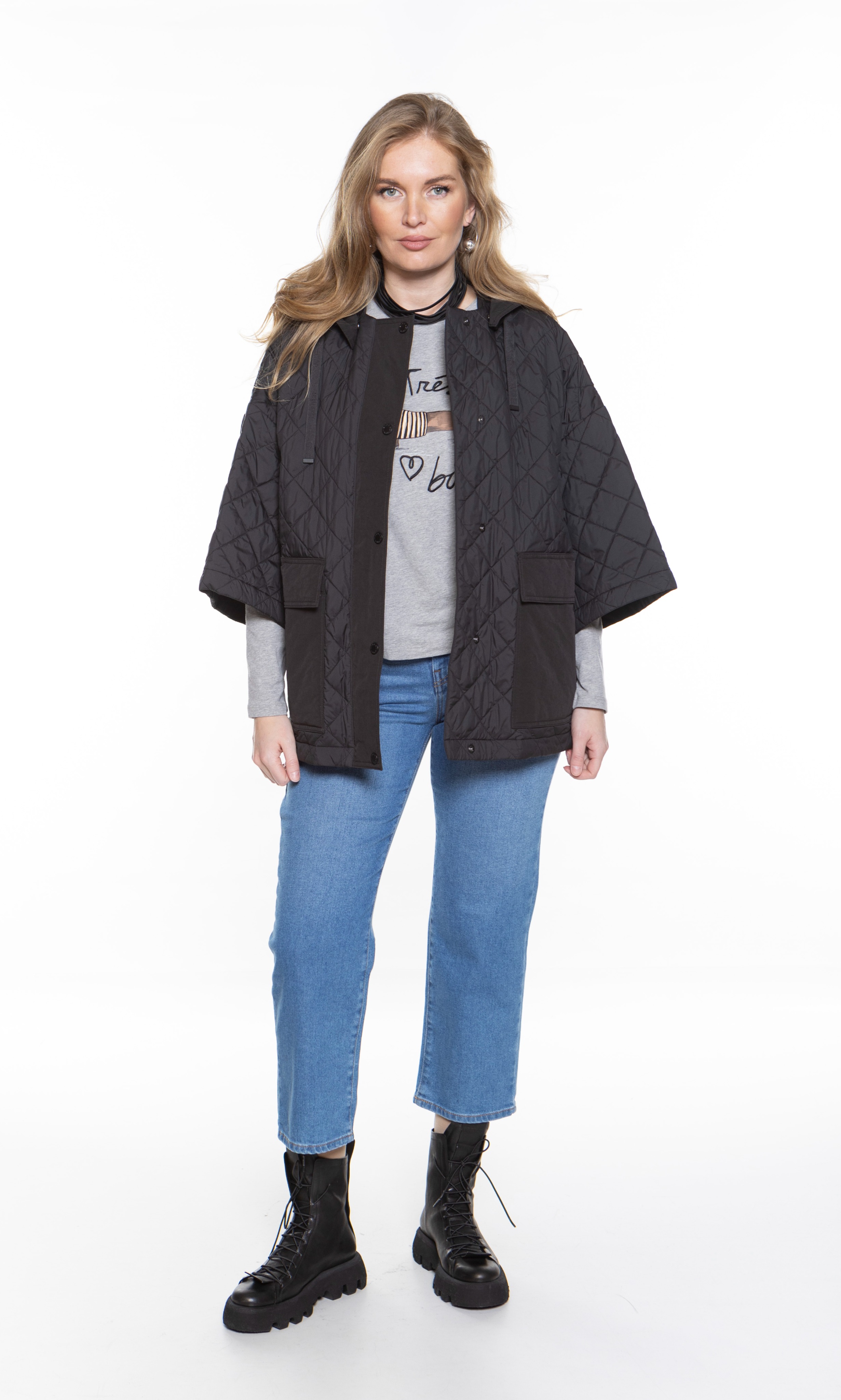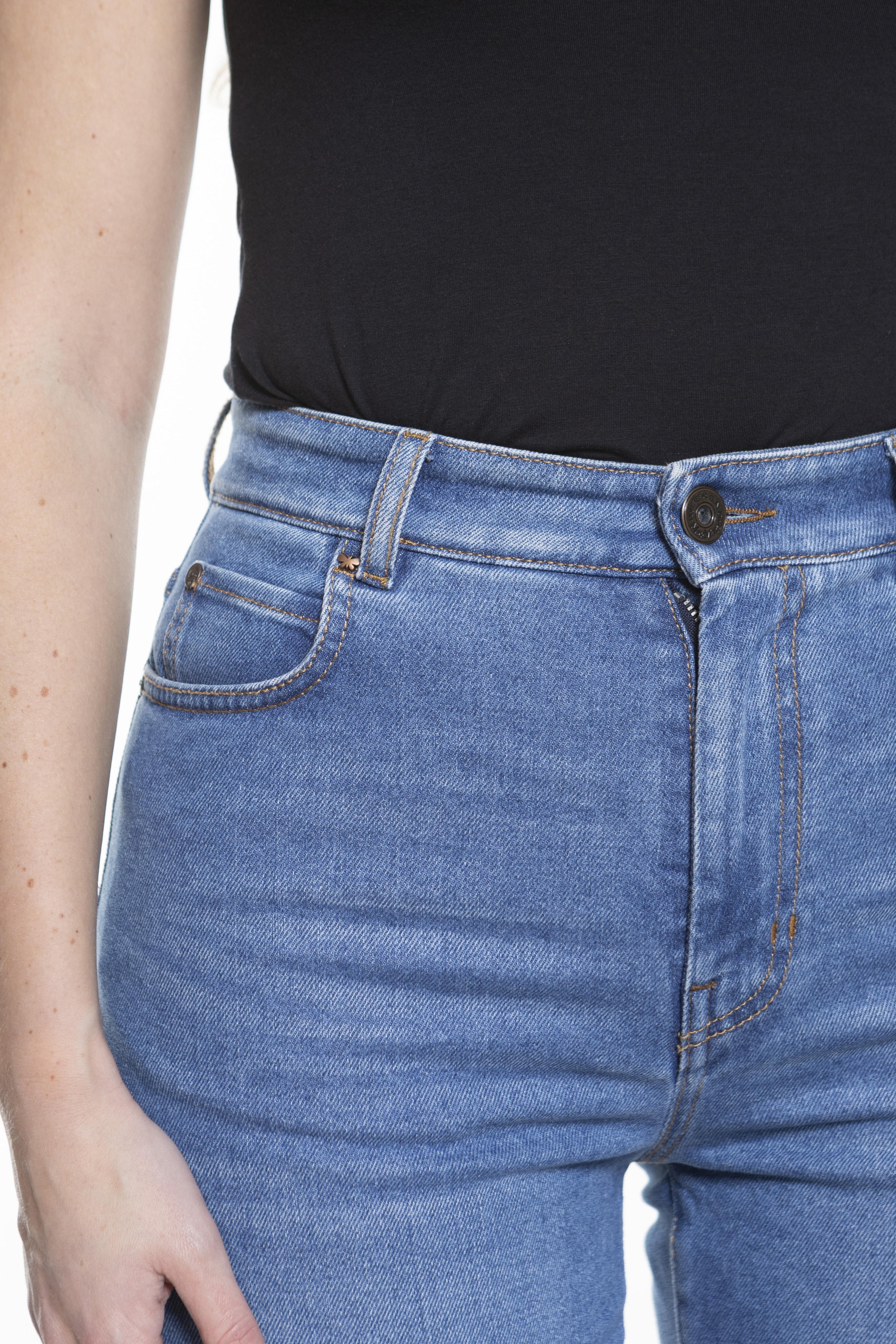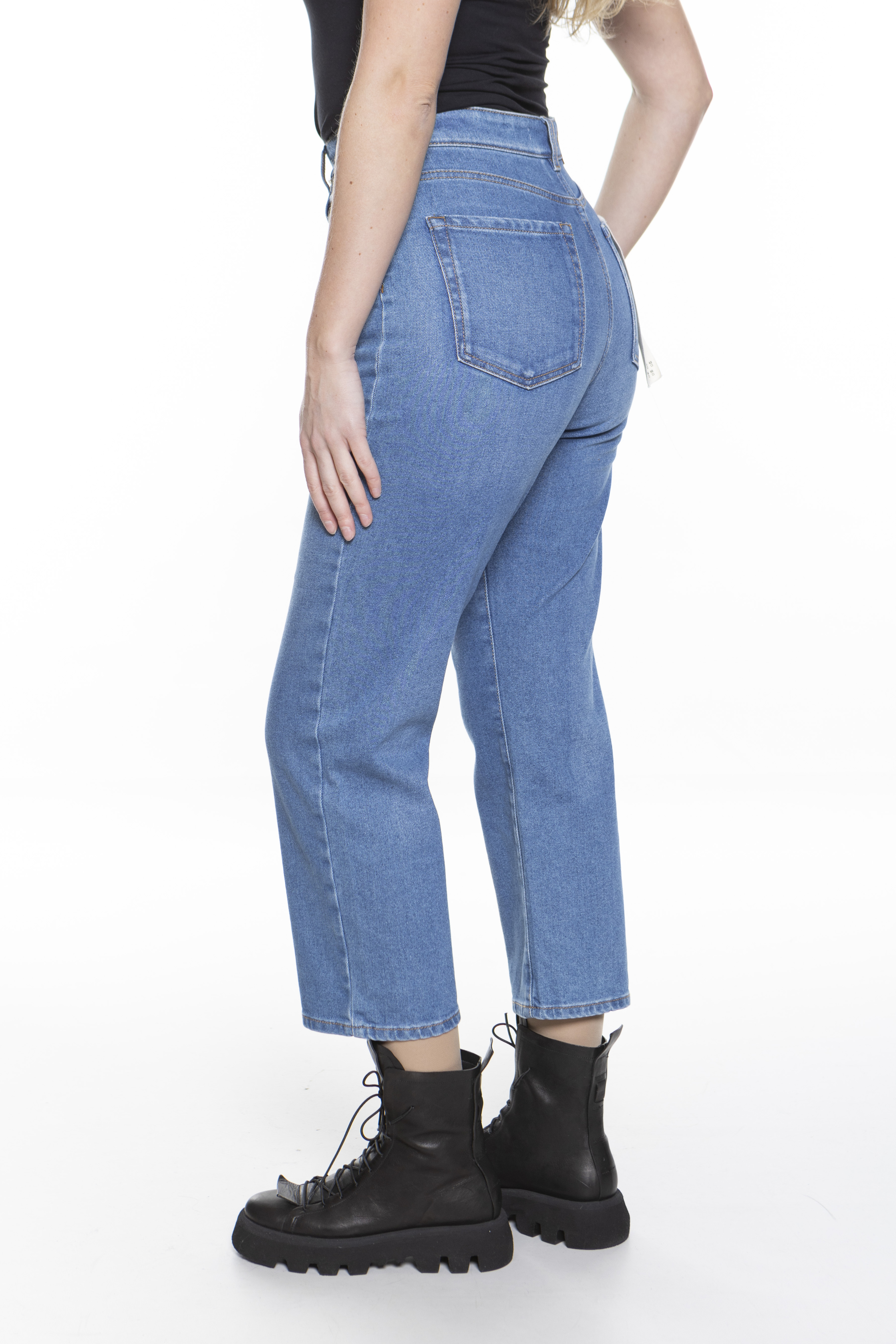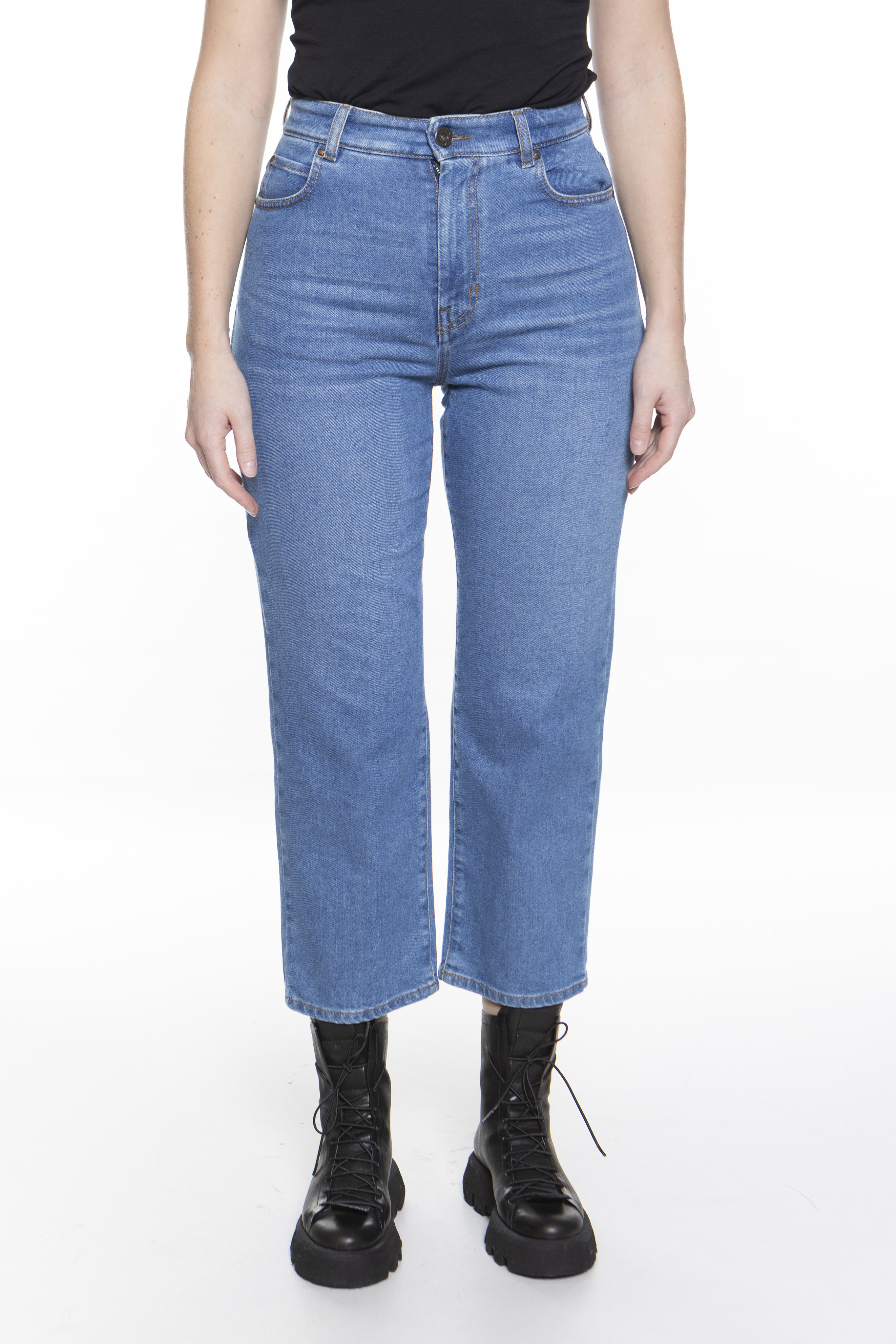 Укороченные джинсы длиной до щиколотки из эластичного хлопкового денима свободного кроя со слегка зауженными книзу. Модель с пятью карманами, отделанная металлическими заклепками и строчкой табачного цвета. Застегивается на потайную молнию и пуговицу.