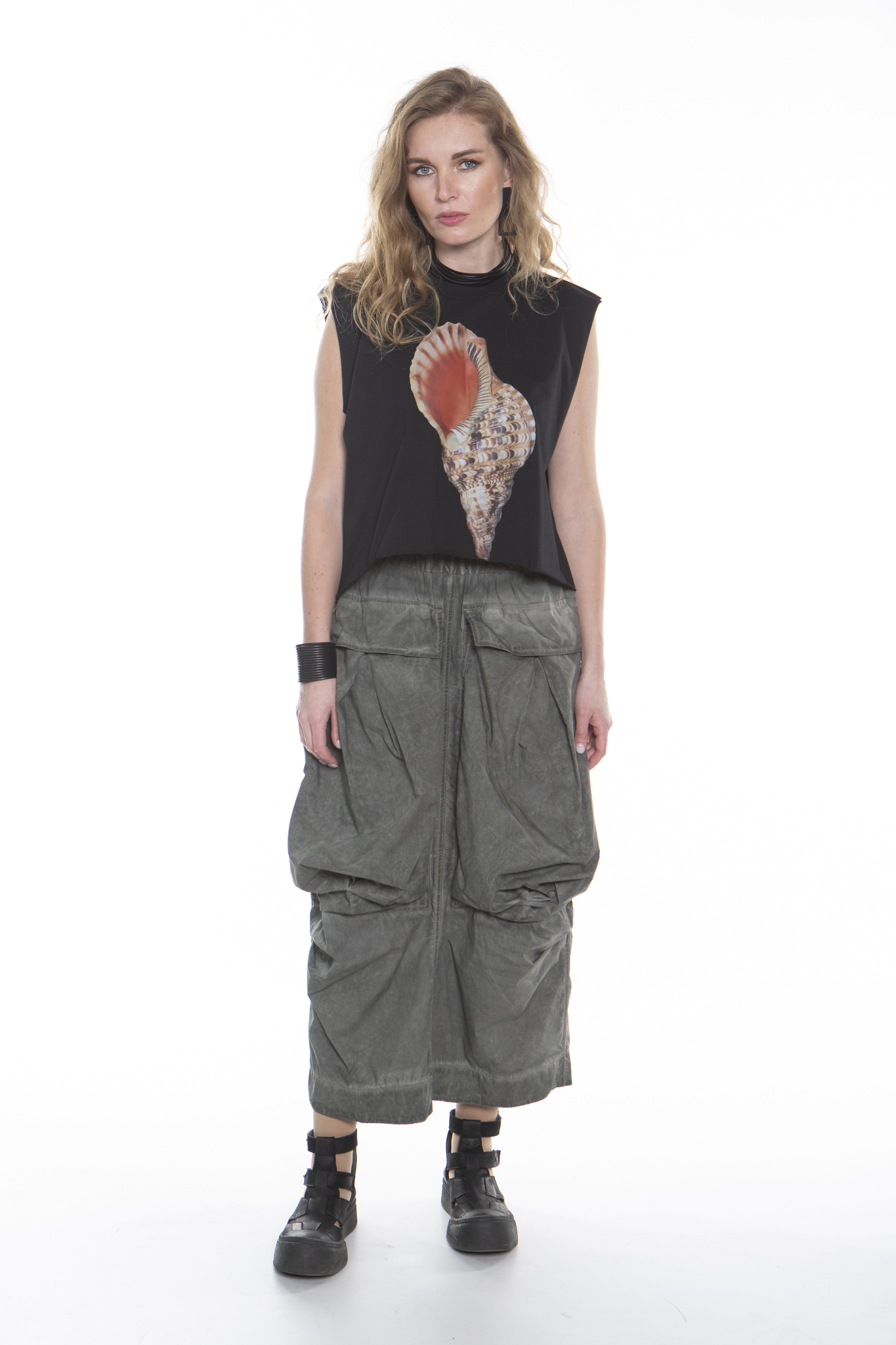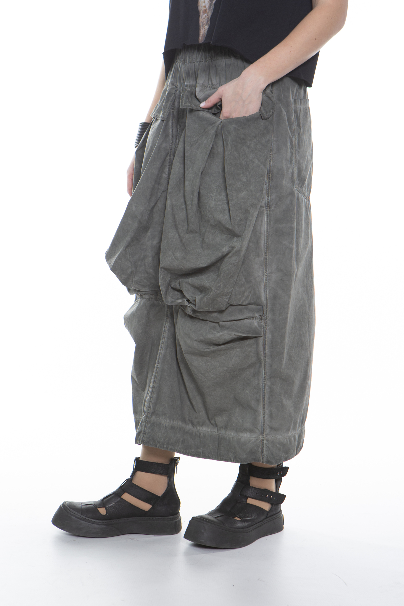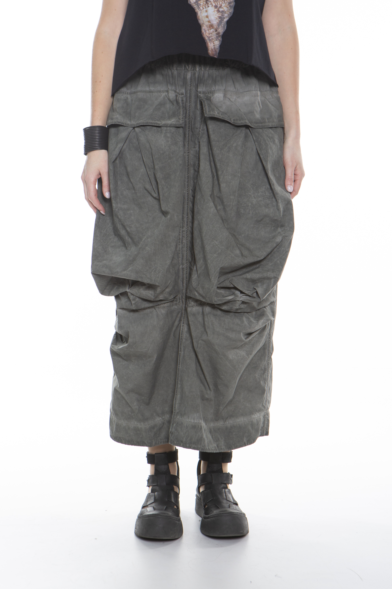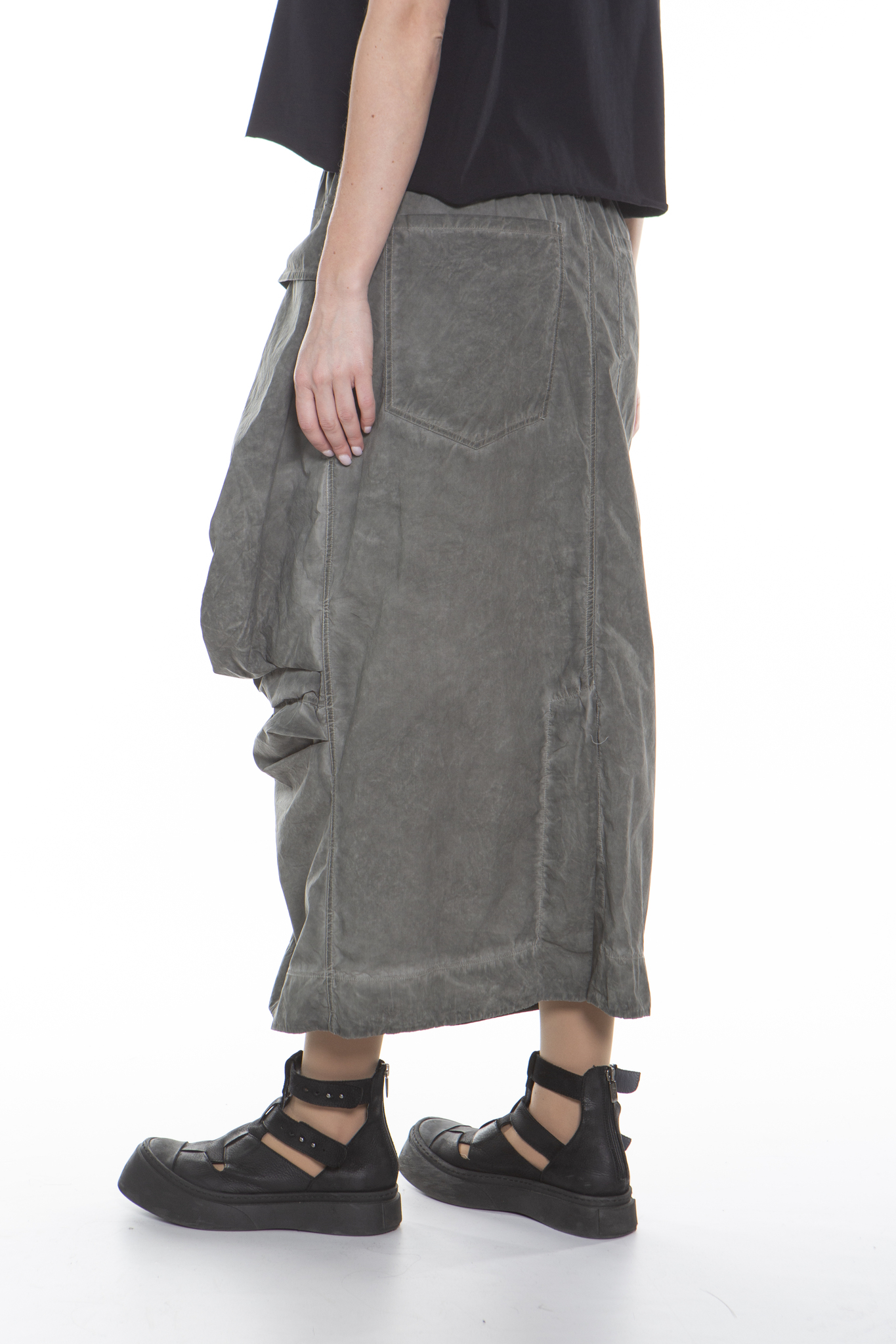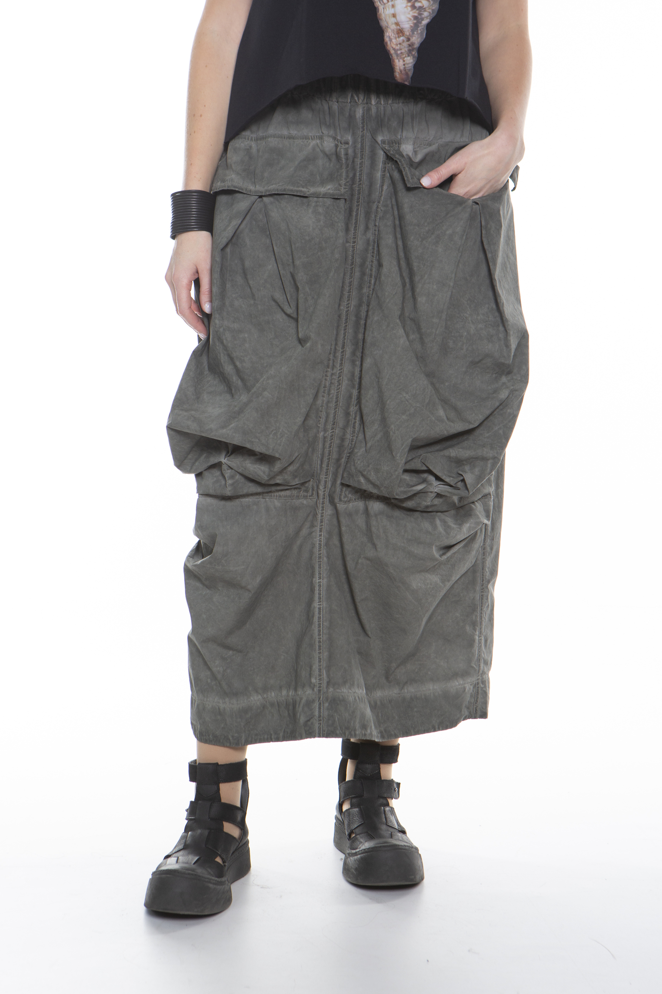 Длинная юбка с эластичным поясом, свободного прямого кроя, из мягкого хлопкового поплина. Юбка имеет два больших передних кармана, два задних кармана и разрез сзади по центру. Изделие прошло специальную процедуру холодного окрашивания.