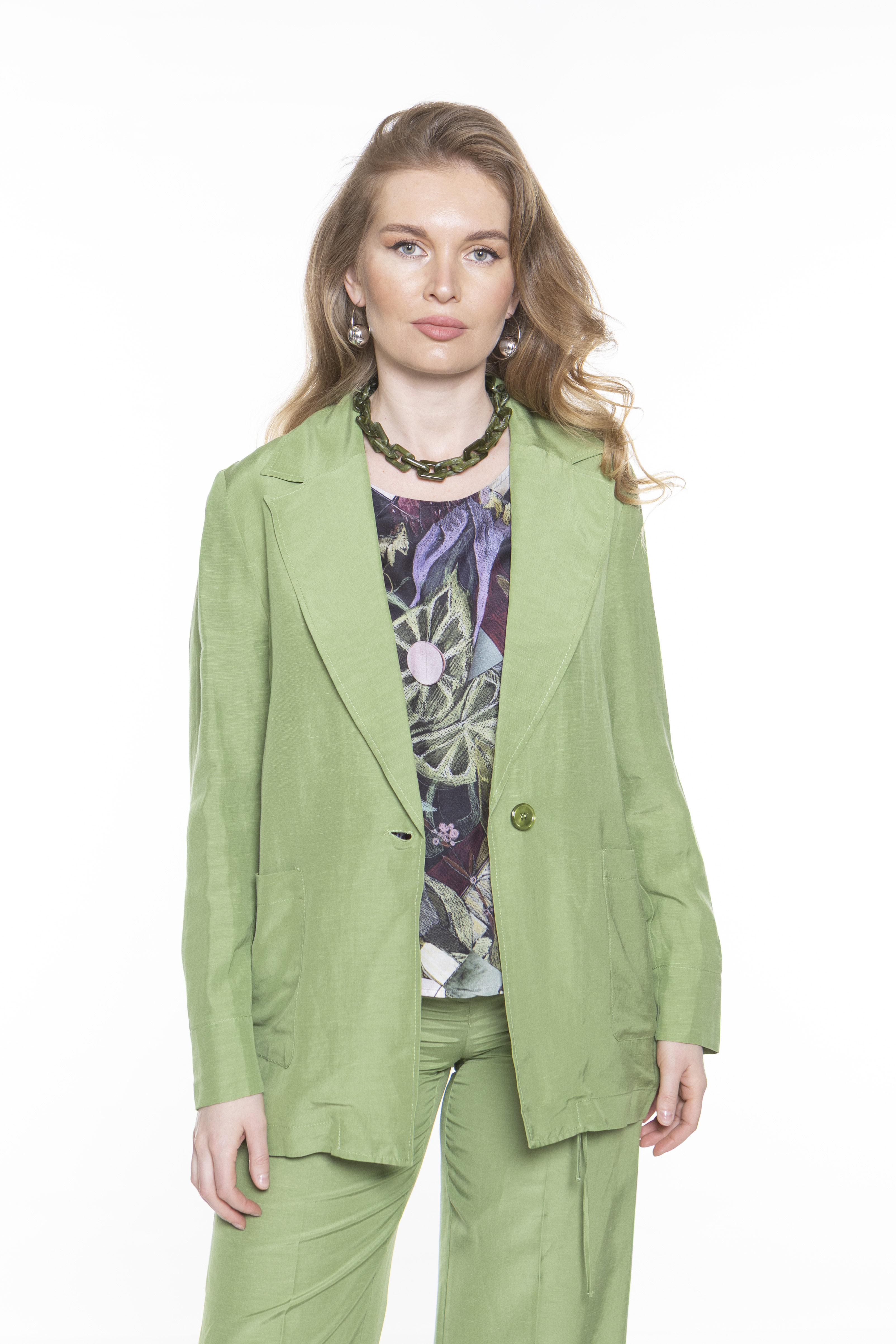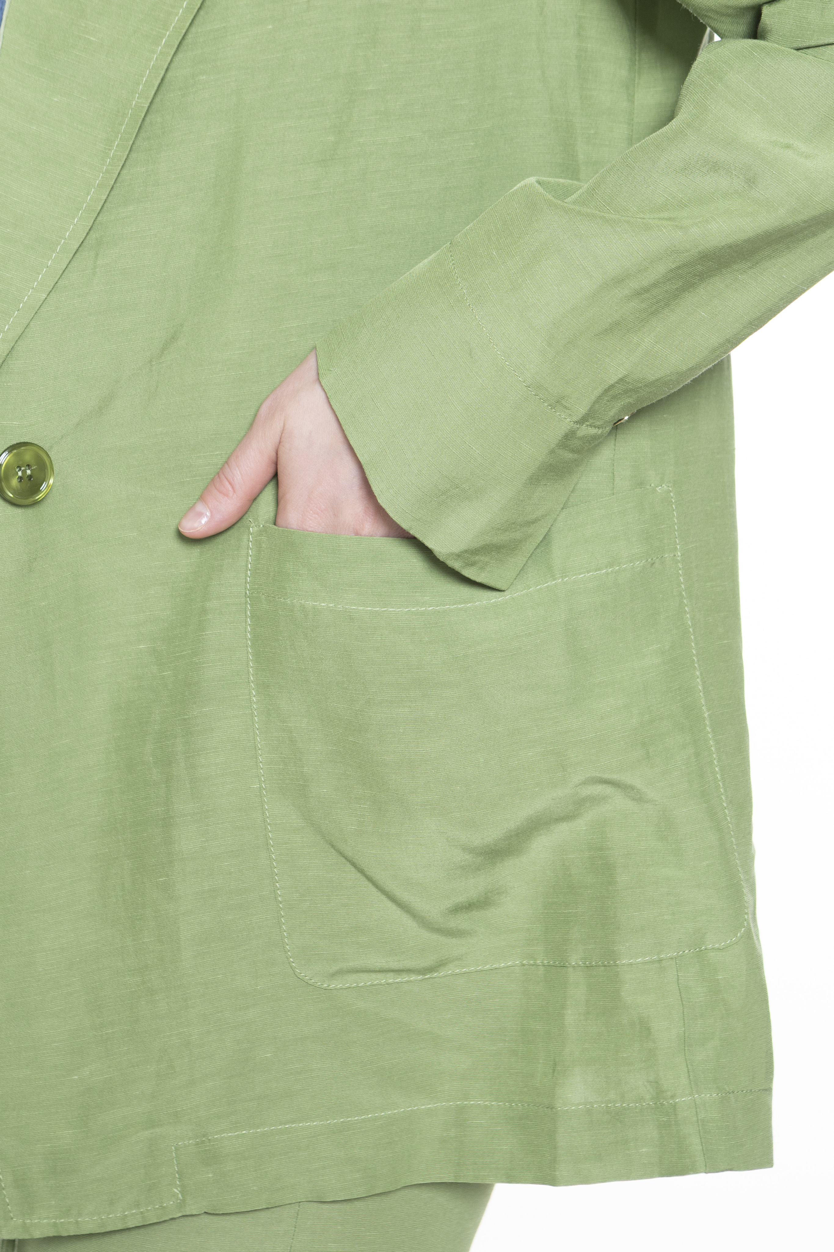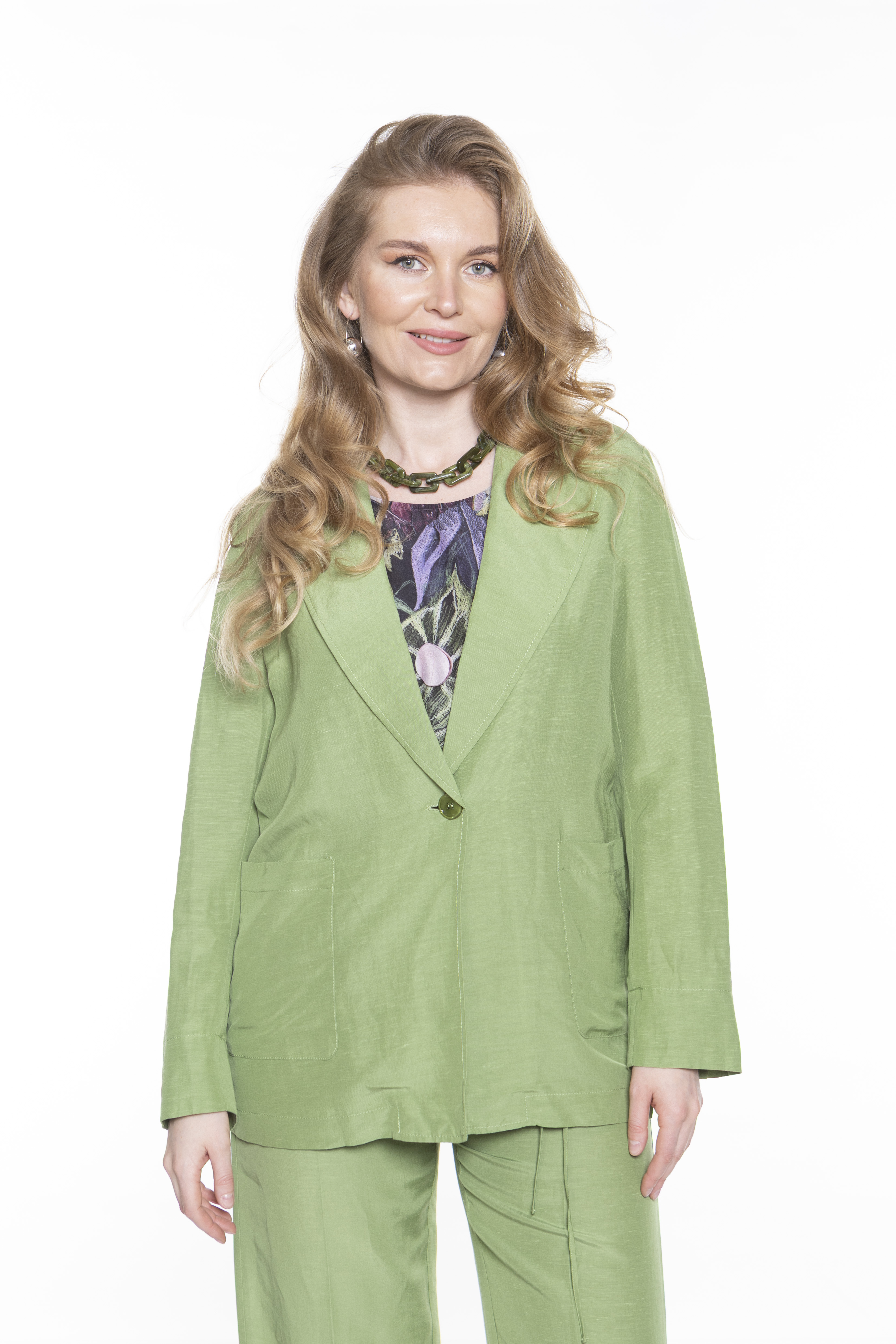 Деконструированный блейзер из льна и вискозы. Однобортный пиджак застегивается на одну пуговицу, а также имеет прямой и свободный удлиненный крой. Широкие лацканы, накладные передние карманы и разрезные манжеты.